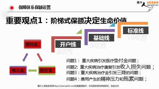 保障体系保额设置 保障体系保额设置 遇到客户觉得保费贵?认为有一点保险就好?或者只喜欢买年金险?健康险做不大保额?最终保单很难销售? 保障体系保额设置 如何建立家庭”无忧”保障体系? 保障体系保额设置 面临:社保保而不包,引发自付问题 社保报销均值55% 封顶线20万600万,出580万(直接放弃) 300万,出280万(基本放弃) 100万,出80万;(变卖) 50万,出30万(借钱) 10万,4.5万(拿的出) 1万,4500元(无所谓)结论:小病不痛不痒,大病伤筋动骨! 保障体系保额设置 问题1:垫付金引发尊严问题 入院后,需垫付金大笔医疗费用 借钱需要时间,借钱不确定,而治疗不能等!借钱需要还,辛苦努力几十年,一病回到解放前! 如果没有钱垫付给医院 1、如果没有钱垫付,就需要找人借钱,没有尊严 2、需要卖房卖车,降低生活品质,家人被拖累! 3、如果没有钱垫付,就需要花光自己的储蓄; 结论1: 保障体系保额设置 问题2:医疗金引发放弃生命代价的问题住院时医疗金更需要大量费用 1、要准备足够的治疗金 2、要准备足够的康复金 3、要准备足够的护理金 结论2:如果没有足够的医疗金,将承担失去生命来做代价,家庭的幸福将被破灭! 保障体系保额设置 问题3:收入引发生活品质问题治疗康复期间收入损失金家庭开支依然存在1、三年的集中治疗 2、两年的康复治疗 3、家人的陪伴误工 结论3:患病不可怕,可怕的是失能的风险,没有收入, 后期的生活会变的极度困难! 保障体系保额设置 思考: 当客户患重大疾病,需要哪三金? 保障体系保额设置 品质生活金 患病损失金 PK 品质教育金 品质养老金 结论4:当医疗金的超支加上收入损失金,会导致降低生活品质,降低教育质量,降低养老标准,甚至灭顶之灾。 保障体系保额设置