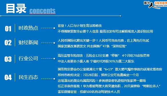 每日新闻速递 2021年7月29日 星期四 目录 时政热点 财经新闻 行业公司 民生百态 官宣!人口与计划生育法将修改 不得强制索取非必要个人信息 最高法发布司法解释规范人脸识别应用 人民币国际化跨出关键一步!人民币可自由兑换,在上海先行先试 国家发展改革委发文 向全国推广47条“深圳经验” 高压监管车险综改:五险企12分支遭“停新” 4个月吃70余张罚单 中法人寿更名小康人寿 宁德时代持股30%为第二大股东 国务院安委会办公室就湖北十堰“6•13”重大燃气爆炸事故约谈湖北省政府 郑州市政府决定:7月28日起,郑州公交可免费乘坐一个月 这场演出的观众均属高风险!多例感染者轨迹指向张家界一剧场 7例感染者曾去张家界 任正非亲自签批!华为智能驾驶大将突遭免职,20天前曾称“特斯拉杀人” 雷军微博官宣:招募500名自动驾驶技术人员 时政热点 官宣!人口与计划生育法将修改 2021年07月27日 11:18 来源:新华社 记者27日从十三届全国人大常委会第九十八次委员长会议获悉,人口与计划生育法修正草案拟提请8月召开的十三届全国人大常委会第三十次会议审议。 今年6月,中共中央、国务院颁布了关于优化生育政策促进人口长期均衡发展的决定,明确提出要实施三孩生育政策及配套支持措施。 不得强制索取非必要个人信息 最高法发布司法解释规范人脸识别应用 2021-07-28 07:30 来源:央视 28日,最高人民法院发布司法解释,对人脸识别进行规范。 最高法有关负责人介绍,近年来,一些经营者滥用人脸识别技术侵害自然人合法权益的事件频发,引发社会公众的普遍关注和担忧。最高人民法院副院长杨万明表示,有些知名门店使用“无感式”人脸识别技术在未经同意的情况下擅自采集消费者人脸信息,分析消费者的性别、年龄、心情等,进而采取不同营销策略。上述行为严重损害自然人的人格权益,亟待进行规制。