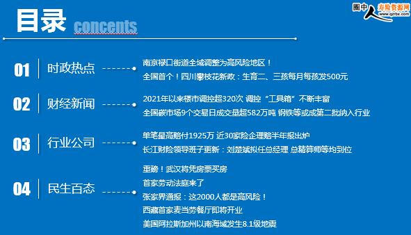 每日新闻速递 2021年7月30日 星期五 目录 时政热点 财经新闻 行业公司 民生百态 南京禄口街道全域调整为高风险地区! 全国首个!四川攀枝花新政:生育二、三孩每月每孩发500元 2021年以来楼市调控超320次 调控“工具箱”不断丰富 全国碳市场9个交易日成交量超582万吨 钢铁等或成第二批纳入行业 单笔最高赔付1925万 近30家险企理赔半年报出炉 长江财险领导班子更新:刘楚斌拟任总经理 总精算师等均到位 重磅!武汉将凭房票买房 首家劳动法庭来了 张家界通报:这2000人都是高风险! 西藏首家麦当劳餐厅即将开业 美国阿拉斯加州以南海域发生8.1级地震 时政热点 南京禄口街道全域调整为高风险地区! 2021年07月29日 11:18 来源:每日经济新闻 据人民日报,7月29日,南京举行疫情防控新闻发布会。市卫健委副主任杨大锁介绍,江宁区禄口街道全域调整为高风险地区。 全国首个!四川攀枝花新政:生育二、三孩每月每孩发500元 2021-07-28 07:30 来源:封面新闻 7月28日,四川省攀枝花市召开新闻发布会,公布并详细解读了攀枝花市《关于促进人力资源聚集的十六条政策措施》。 新政中,包括高层次人才待遇激励、提供创新创业支持和奖励提供就业补贴、外地和本地户籍学生享受同等待遇等多项具体措施。其中,对按政策生育二、三孩的攀枝花户籍家庭,每月每孩发放500元育儿补贴金,直至孩子3岁,是全国首个也是目前唯一一个发放育儿补贴金的城市。