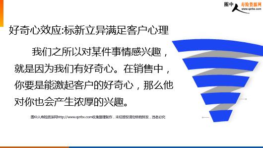 客户心理洞察分享 为什么有些销售员一见面就能获得客户的好感? 为什么有些销售员一说话就能吸引客户的注意? 为什么有些销售员一微笑就能打动客户的心?我该怎么做? 销售中你必须要知道的九个心理效应 特别的爱给特别的你。 在销售中,身为销售员的你要时时掌握主动权,如果你在同客户的交谈中跟着客户的思路走了,那么呢的这次销售活动也就“危险”了,如何才能步步为营,获得成交机会,那么,通过了解九个心理效应,将有助于你掌握被客户喜欢的技巧,从而实现你的销售目的。 亲和力效应:亲和力让你贴近客户 用微笑面对客户与客户成为朋友自信的人最具有亲和力 首因效应:自信是推销自己的法宝 首因效应也叫首次效应、优先效应或“第一印象”效应。它是指当人们第一次与某物或某人相接触时会留下深刻的印象。 提高自己自信的方法 一、提高自信从开会坐前面一点儿开始二、走路快一点儿三、穿衣服要特别一点儿 快乐效应:快乐心理带来快乐销售 所谓快乐效应是指在销售中销售员用自己的快乐心态去感染客户,那么客户也会因为你的快乐而快乐,那时候,你做的就是快乐销售,因而更能受客户欢迎。 开场白效应:抓住客户的心 唤起客户的好奇心找出产品的价值所在吸引客户的注意力真诚地关心客户从第三者处获得支持寻找共同的话题对客户表示感谢 好奇心效应:标新立异满足客户心理 我们之所以对某件事情感兴趣,就是因为我们有好奇心。在销售中,你要是能激起客户的好奇心,那么他对你也会产生浓厚的兴趣。 借势效应:“他山之石,可以攻玉” 我们每个人都不是圣人,都会有我们办不到的事和达不到的目的,但是有时候我们自己做不到的事可以借助于别人的力量来完成,这就是借势效应。 如何借势 一、完善的售后服务可以让客户更放心二、在老客户身上多投入精力、资源三、适时地给帮助自己推销的客户一些好处 当你在一个平静的水池中投进一颗石子,就会从中心处泛起涟漪,慢慢地向外扩展。假象你就是那涟漪中心…... 投其所好效应:最有效的心理攻势 真心的赞美客户寻找客户感兴趣的话题 投其所好有时候是对别人的一种尊重,真心实意地区赞美客户的成就以及找到客户的兴趣爱好,可以为我们的销售服务。