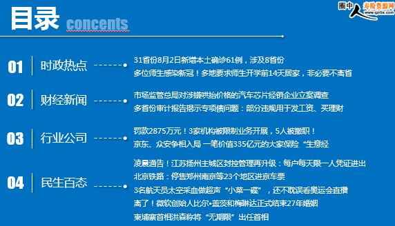 每日新闻速递 2021年8月4日 星期三 目录 时政热点 财经新闻 行业公司 民生百态 31省份8月2日新增本土确诊61例,涉及8省份 多位师生感染新冠!多地要求师生开学前14天居家,非必要不离省 市场监管总局对涉嫌哄抬价格的汽车芯片经销企业立案调查 多省份审计报告揭示专项债问题:部分违规用于发工资、买理财,资金闲置严重 罚款2875万元!3家机构被限制业务开展,5人被撤职! 京东、众安争相入局 一笔价值335亿元的大家保险“生意经 凌晨通告!江苏扬州主城区封控管理再升级:每户每天限一人凭证进出 北京铁路:停售郑州南京等23个地区进京车票 3名航天员太空采血做超声“小菜一碟”,还不耽误看奥运会直播 离了!微软创始人比尔•盖茨和梅琳达正式结束27年婚姻 柬埔寨首相洪森称将“无期限”出任首相 时政热点 31省份8月2日新增本土确诊61例,涉及8省份 2021年08月03日 11:18 来源:新京报 据国家卫健委消息,8月2日0—24时,31个省(自治区、直辖市)和新疆生产建设兵团报告新增确诊病例90例,其中境外输入病例29例(云南8例,广东6例,天津3例,上海3例,四川3例,江苏2例,陕西2例,福建1例,山东1例),本土病例61例(江苏45例,湖南6例,湖北3例,河南2例,云南2例,北京1例,上海1例,福建1例);无新增死亡病例;无新增疑似病例。 多位师生感染新冠!多地要求师生开学前14天居家,非必要不离省 2021-08-03 14:21 来源:人民日报 截至8月1日24时,南京疫情传播链延长到至少365人、外溢至少24个城市。记者梳理各地卫健委通报的详情发现,此次疫情波及的病例小到几个月,高至80几岁的老人。其中,还有老师和学生。 多地除加强校园假期疫情防控和重点人群排查外,还要求师生开学前14天居家,非必要不离省,全国各地已经开始组织启动12到17岁人群新冠疫苗接种工作。
