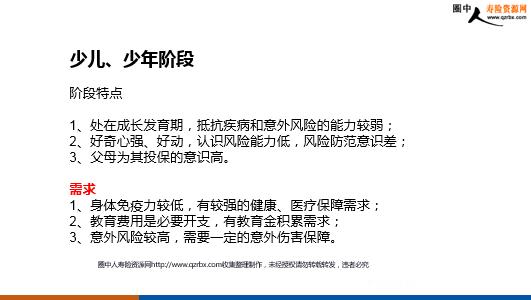 人生不同阶段保障需求分析 1、百岁人生时代来临,人人带病长期生存; 2、长寿时代、健康时代、财富时代,“长寿经济”伴生而来; 3、一定要改变中国老年人对生命的态度,要创造一种新的生活方式,为自己而活。 单身期 保障需求不高,追求高回报,风险承受能力强,可考虑年金型保险产品,作为对于未来家庭资金的积累。 家庭形成期 处于家庭和事业的新起点,投资意识较强,有较大的风险承受能力,可根据资本市场现状,推荐投资型保险产品,为预期的大额消费,积少成多,对期交产品有需求,保证房屋供款的连续性,购买一些意外险。子女教育是重中之重,可购买定期保险、少儿险、补充教育费用;自身的安全、健康也必须考虑,不仅仅是意外和医疗,还应考虑防御重大疾病;考虑保费的合理性,提前购买一定的养老险。 家庭成长期人到中年,身体的机能明显下降,对医疗、重疾的需求较大;要为将来的老年生活做好安排,应该重点购买养老险;进入人生后期,万一风险投资失败,会葬送一生累积的财富,所以不宜选择风险过大的投资方式。 家庭成熟期家庭衰老期应拥有用于晚年生活的医疗及养老资金并确保安全。 少儿、少年阶段 阶段特点 1、处在成长发育期,抵抗疾病和意外风险的能力较弱; 2、好奇心强、好动,认识风险能力低,风险防范意识差; 3、父母为其投保的意识高。 需求 1、身体免疫力较低,有较强的健康、医疗保障需求; 2、教育费用是必要开支,有教育金积累需求; 3、意外风险较高,需要一定的意外伤害保障。 青年阶段 阶段特点 1、经济收入相对较低但花销较大;收入增速可能较快; 2、健康状况良好,抵御风险能力较强; 3、一般为单身,无家庭负担,保险意识较弱; 4、追求时尚,容易接受新鲜事物。 需求 1、需考虑因个人意外风险导致的父母无法赡养问题; 2、需要养成良好的储蓄习惯中年阶段-形成期 阶段特点 1、从结婚到孩子出生,一般为1-5年 2、具备初步生活经验,保障意识和需求有所增强; 3、收入趋向稳定并有所提高,家庭建设支出较大; 4、事业处于上升阶段,压力较大。 需求 1、为保证家庭建设的连续性,需考虑财务储备; 2、需要考虑疾病和意外可能对家庭造成的巨大的经济伤害。 中年阶段-成长期 阶段特点 1、从孩子出生到参加工作,这段时间大约20-25年; 2、家庭经济压力开始加大; 3、家庭责任加重,上有老、下有小,抚养孩子和赡养老人的压力较大; 4、风险保障意识逐渐增强。 需求 1、需关注家庭成员的健康和安全; 2、应通过多种方式来准备子女教育费用; 3、需逐步考虑自己的养老负担和需求。中老年、老年阶段 阶段特点 1、夫妇双方陆续退休,子女参加工作,这段时间一般为20年以上; 2、子女逐渐自立,负担逐渐减轻; 3、收入来源减少,经济能力降低; 4、夫妇双方年纪渐长,健康状况下降。 需求 1、应拥有用于晚年生活的资金并确保安全; 2、比任何时候更应关注自己健康; 3、需适时考虑遗产规划问题。 感谢聆听