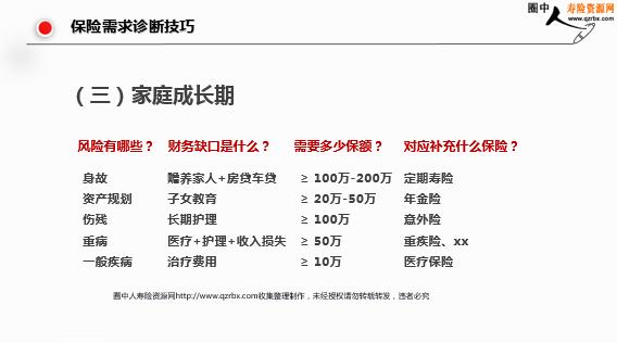 保险需求诊断技巧 保险需求诊断技巧 课程目的 通过本节课程学习,让学员清楚现代家庭保险需求并根据分析找到保障缺口。 保险需求诊断技巧 思考一:人的一生都有哪些保险需求? 1、家庭经济支柱的足额保障需求 2、重大疾病保障需求 3、教育保险需求 4、高品质的养老需求 5、资产配置与传承需求 保险需求诊断技巧 思考二:现代家庭应按哪几个阶段衡量保障需求 1、单身期 2、家庭形成期 3、家庭成长期 4、家庭成熟期 保险需求诊断技巧 现代家庭保险需求 保险需求诊断技巧 身故伤残重病一般疾病 赡养父母长期护理+赡养父母医疗+护理+收入损失治疗费用 ≥50万-100万 ≥50万 ≥50万 ≥10万 定期寿险意外险重疾险、xx 医疗保险 (一)单身期 风险有哪些? 财务缺口是什么? 需要多少保额? 对应补充什么保险? 保险需求诊断技巧 (一)单身期保险需求配置 单身期保险需求排序:意外险、定期寿险、重疾险、医疗险 保险需求诊断技巧 身故伤残重病一般疾病 赡养家人+房贷车贷长期护理+赡养家人医疗+护理+收入损失治疗费用 ≥100万-200万 ≥100万 ≥50万 ≥10万 定期寿险意外险重疾险、xx 医疗保险 风险有哪些? 财务缺口是什么? 需要多少保额? 对应补充什么保险?