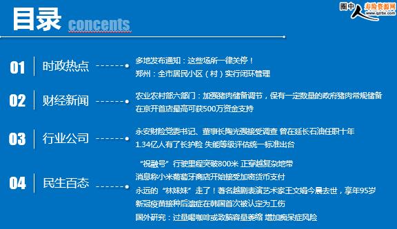每日新闻速递 2021年8月7日 星期六 目录 时政热点 财经新闻 行业公司 民生百态 多地发布通知:这些场所一律关停! 郑州:全市居民小区(村)实行闭环管理 农业农村部等六部门:加强猪肉储备调节,保有一定数量的政府猪肉常规储备 在京开首店最高可获500万资金支持 永安财险党委书记、董事长陶光强接受调查 曾在延长石油任职十年 1.34亿人有了长护险 失能等级评估统一标准出台 “祝融号”行驶里程突破800米 正穿越复杂地带 消息称小米葡萄牙商店开始接受加密货币支付 永远的“林妹妹”走了!著名越剧表演艺术家王文娟今晨去世,享年95岁 新冠疫苗接种后遗症在韩国首次被认定为工伤 国外研究:过量喝咖啡或致脑容量萎缩 增加痴呆症风险 时政热点 多地发布通知:这些场所一律关停! 2021年08月05日 11:18 来源:人民网 “多点开花”的传播链不断延长,机场、火车站、棋牌室等公共人群聚集区,成为疫情扩散焦点。已有多地发布通知,暂时关闭棋牌室、麻将房等室内密闭休闲场所。截至8月4日,全国已有20个省区市的1152家A级旅游景区暂停开放。 郑州:全市居民小区(村)实行闭环管理 2021-08-06 14:21 来源:证券时报 据郑州发布8月6日消息,郑州市新冠肺炎疫情防控领导小组办公室发布进一步加强管控措施的通告。通知明确,郑州市居民小区(村)实行闭环管理,严格落实“测温扫码”措施,减少人员流动。其中:中高风险地区内居民“足不出户”,健康码标记红色;封控区域内居民“足不出院”,健康码标记黄色,每天每户可安排一人持出入证(由社区办理)外出购置必需生活物品;其他居民坚持“非必要不出市”。全市各级党政机关事业单位实行弹性工作制。严禁各类集聚性活动,非生活必需场所一律暂时停业。