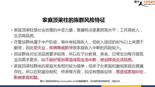 角色定位客群定位风险分析—家庭顶梁柱篇 孩子的健康紧扣妈妈心弦 家庭顶梁柱-负重前行,苦中作乐 他们,是城市中最忙碌的一群人,每天穿梭在都市的车流与人流中,离不开电脑和手机;他们,是许多人眼中光鲜的一群人,拿着高薪过着小资生活;他们,是有些清高、追求独立与自由的一群人,希望靠自己的能力闯出一片天;他们,也是挣扎在生存之上、生活之下的一群人,自知这表面的光鲜也许只是“看上去很美”…… 他们,就是城市中居于“中流砥柱”的一群人,也是家庭的顶梁柱。 孩子的健康紧扣妈妈心弦 家庭顶梁柱-客群画像 行内资产5万-50万 80后居多 孩子的健康紧扣妈妈心弦 家庭顶梁柱-客群画像-客群特点 孩子的健康紧扣妈妈心弦 家庭顶梁柱-客群画像-家庭财务特点 缺少理财渠道和时间,偏向稳健保本型理财产品,考虑性价比因素 收入持续提升,但存在不确定性,工资是家庭主要经济来源,一般为月薪制 家人健康问题将会对经济产生巨大影响 子女成长、未来养老是持续压力 孩子的健康紧扣妈妈心弦 风险分析 孩子的健康紧扣妈妈心弦 为了家人的幸福,您任劳任怨,因为您是顶梁柱 您若安好,便是晴天 风险: 收入中断家庭遇困 养老生活品质下降 投资风险财富损失 孩子的健康紧扣妈妈心弦 风险一:收入中断 ◎顶梁柱是家庭生活的发动机,为生活提供源源不断的收入,促使家庭生活品质逐步提升。威胁顶梁柱收入中断的风险因素为:失业、重大疾病、身故等。 受公司经营战略调整、企业收购等因素影响,涉及经营政策的改变和员工的岗位调整。 失业是职场人士最大的担忧之一,一旦失业,就会面临养家糊口、子女教育、赡养父母、房贷车贷等中断的危机。 孩子的健康紧扣妈妈心弦 工作压力、不良习惯、长时间加班等因素导致职场人士重疾发病率居高不下! 既要保证身体健康,更应保障收入能力! 孩子的健康紧扣妈妈心弦 罹患重疾不一定要命,但一定要钱…… 各国癌症五年生存率统计 孩子的健康紧扣妈妈心弦 世卫组织称:中国每年超20万人死于交通事故