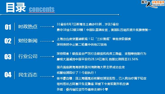 每日新闻速递 2021年8月9日 星期一 目录 时政热点 财经新闻 行业公司 民生百态 31省份8月7日新增本土确诊81例,涉及5省份 勇夺38金32银18铜!中国队圆满收官,美国队压哨反超升奖牌榜第一 上海出台房贷重磅新规!以“三价就低”审批贷款额度 深圳突然中止第二轮集中供地22宗地出让 业内:或因报名火热致竞拍规则调整 深挖彻查!银保监会严厉打击银保机构员工隐蔽、变相等持股行为 摩根大通减持中国平安约28.14亿港元 持股比例降至11.56% 国内首座跨海高铁桥泉州湾跨海大桥主桥成功合龙 核酸检测降价了!今起执行! 林书豪自曝:回上海隔离后核酸检测呈阳性,已入院治疗属于轻症 塔利班攻占阿富汗朱兹詹省 拜登下令美军轰炸机空袭 外媒:委内瑞拉货币币值将去掉6个零 时政热点 31省份8月7日新增本土确诊81例,涉及5省份 2021年08月08日 11:18 来源:新京报 据国家卫健委消息,8月7日0—24时,31个省(自治区、直辖市)和新疆生产建设兵团报告新增确诊病例96例,其中境外输入病例15例(上海6例,云南4例,广东3例,四川2例),本土病例81例(江苏38例,河南24例,云南7例,湖北6例,湖南6例);无新增死亡病例;新增疑似病例3例,均为境外输入病例(均在上海)。 勇夺38金32银18铜!中国队圆满收官,美国队压哨反超升奖牌榜第一 2021-08-08 14:21 来源:球哥侃球 东京奥运会最后一天,随着李倩在女子中量级拳击比赛中不敌英国选手普莱斯夺得一枚银牌之后,中国队本届奥运会所有参赛项目正式结束,最终,我们夺得了38枚金牌,32枚银牌和18枚铜牌,总共获得88枚奖牌,圆满收官,同时也锁定了奖牌榜第二名的位置。 在最后一个比赛日之前,中国队在金牌榜上一直处于领先位置,不过随着美国队在最后几个比赛日多个夺金点成功夺得金牌,最终他们以39金压哨反超我们,重新登顶奖牌榜第一位。