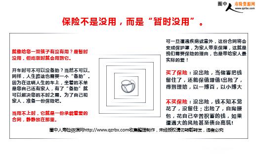 保险功用的12345 买了保险,就不会因为一次疾病毁掉我所有的努力;买了保险,就不会因为一次事故消耗我积累的财富;买了保险,就不会因为一次意外毁掉我家庭的幸福;买了保险,就不会在风烛残年体弱多病时没钱养老; 买了保险,就不会让自己的一个不小心拖累年迈父母、娇弱妻子、稚嫩孩子...... 只为1个目的 一个人一生中都有可能遇到突发的风险,自己或家人生大病,意外伤残、死亡等。 任何人遇到风险来临,都需要花费大量的金钱,更甚者,还会导致入不敷出。 而往往此时,只有人寿保险可以用最快的速度提供大量的现金来帮助你。 救急防贫 只卖2个商品 时间与金钱 如果一个人因故不能再为他的家人带来收入,那么,只有人寿保险会支付一大笔金钱陪伴他们; 如果一个人可活到80岁,乃至100岁,只有人寿保险会因为他在年轻时日积月累交纳过保费而向他支付养老金,让他颐养天年。 承担3大责任分担4类压力生活费用:生存需要物质,生活需要品质,生命需要价值,万一没有赚钱的能力与时间,这三方面该如何保证? 医疗费用:不论小病还是大病,你都必须支付一定的医疗费,准备好了吗? 养老费用:收入减少、支出增多、身体渐弱,结束几十年的工作后,你将如何快快乐乐地度过晚年生活? 丧葬费用:人终归有离开世上的一天。向前人看,你光宗耀祖了吗?向后人看,你留下的是债务还是财富?这些压力,只有人寿保险可以责无旁贷地分担。 提供5大保障收入保障:在遇到万一时,为家人提供相当于今后若干年收入的现金。 财产保障:保证财产属于你,同时保证家族的财产不缩水。 家族前途保障:实现子女享受教育的计划,实现家族永远鼎盛的梦想。 家庭责任保障:能够真正做到“孝敬父母”“抚养子女”“夫妻互敬互爱”。 生命价值保障:保证生病时有医疗费,保证家人不因债务而穷困潦倒,保证生命价值的延续。 买不买保险,不需要问别人、问自己三个问题就好! 很多人买保险喜欢听别人的意见,如果是听取专业人士的意见还好,要是听一个对保险有偏见而且没买过保险的人,那可能会使自己错过最佳投保时机,甚至后悔莫及。 1.如果生病了,谁可以给我30万? 2.如果发生意外了,谁能帮我抚养小孩、照顾家人、还房贷车贷? 3.如果治好了病,但后续维持生活还需要50万,谁可以借给我? 保险不是没用,而是“暂时没用”。 就像给您一双筷子有没有用?是暂时没用,但吃饭时就会用到它。 开车时可不可以没备胎?当然不可以。同样,人生路途也需要一个“备胎”。因为在这辆人生的车上,坐着的不单是您自己还有家人,有了“备胎”就可以解决您的不时之需。为了自己和家人,准备一份保险吧。 当用不上时,它就是一份承载着爱的合同,静静放在那里。 可一旦遭遇疾病或意外,这份合同将会变成保护罩,为家人带来保障,这就是我们需要保险的理由,也是带给家人最实际的爱! 买了保险:没出险,当储蓄把钱留住了,还能保值增值!出险了,得到理赔,以一搏百,以小搏大 不买保险:没出险,钱不知不觉花了,没留住;出险了,自掏腰包,花自己辛苦积蓄的钱,如果遭遇大的风险甚至债台高筑!
