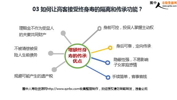 精准制导,直击需求 ——增额终身寿险分客群销售逻辑 世上有包治百病的灵药吗? 你会如何为客户配置医疗保障计划? 中产客群 一般收入人群 财 富 量 高净值人士 增额终身寿分客群需求 中产客群 一般收入人群 财 富 量 高净值人士 如何从长期锁利角度打动一般收入人群? 1.货币供应量增加会加速利率下行: 截至2020年12月,广义货币(M2)同比增长10.1%,已实现连续十个月双位数增长; 2020年全国GDP2.3% 2.定向降准、LPR调整 1.如果我们未来发展的好:参照美国的利率水平; 2.如果我们未来发展的不好:参照欧洲和日本的利率水平。 美国:低利率周期 如何激发中产客户对增额寿险的养老配置需求? 长寿是幸运还 是烦恼? 人类最大的焦虑——未知! 18岁-64岁的劳动人口 65岁以上人口 02如何激发中产客户对增额寿险的养老配置需求? 45岁王总是一名企业主,资产目前5千万,一直在为资产过亿的“小目标”而拼搏,至今尚未成功,同时王总积极响应国家号召最近王太太生了三胎儿子小王,并希望把成为亿万富翁的理想寄托在小王身上。xxxx分公司李经理通过xxxx终身寿险为王总父子量身定制了亿万富翁实现计划,具体计划如下。 企业更多的数据将被税局掌握,监控也呈现全方位、立体化,以后想在税务上动歪脑筋更加行不通了! 03如何让高客接受终身寿的隔离和传承功能? 金税四期到底强大到何种地步 金税四期 企业家最易触犯的十大罪名 ●挪用资金罪:公司与公司股东均是各自独立的法律主体,公司与股东之间的财产当然也互相独立 ●贪污罪、职务侵占罪:安邦集团董事长吴小晖案、真功夫原董事长蔡达标案 ●合同诈骗罪 ●非法吸收公众存款罪:“e租宝”案 ●非法经营罪 《企业家刑事风险分析报告》——北京师范大学中国企业家犯罪预防研究中心、刑事法律科学研究院 03如何让高客接受终身寿的隔离和传承功能? ●虚开增值税专用发票罪 ●受贿罪、行贿罪、单位行贿罪:犯单位行贿罪的,不仅仅对单位判处罚金,对单位直接负责的主管人员和其他直接责任人员,也会追究判处五年以下有期徒刑或拘役
