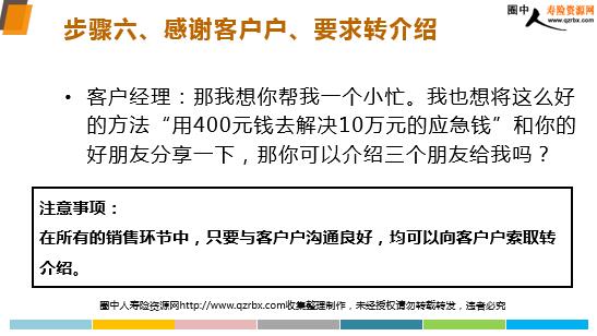 简单销售法的定义 步骤及演练 目录 简单销售法的定义 简单销售法的步骤 背诵、演练及点评 课后作业 简单销售法的定义 是指客户经理与客户面对面接触,对客户做观念导入和需求激发,并约定下次递送建议书的过程。简单销售法的步骤步骤一、建立轻松良好的关系步骤二、道明来意步骤三、观念导入步骤四、解决方案步骤五、约定递送和讲解建议书的时间步骤六、感谢客户、要求转介绍步骤一、建立轻松良好的关系客户经理:老陈,一段日子没见了,听说最近你升职了,恭喜你呀!客户:谢谢,你最近怎么样?步骤二、道明来意客户经理:我最近加入了xx,还了解到一个很多人都觉得不错的理财经验。我今天主要是想和你分享一下这个经验,那就是“如何用400块钱解决10万块钱应急钱的问题”。注意事项:简单寒暄后,迅速道明来意进入主题。步骤三、观念导入草帽图(人生规划图) 观念导入讲解逻辑 观念导入讲解逻辑 客户经理:可是,老陈,你想没想过,我们什么情况下会中断收入呢?客户:大概是生病、残疾、失客户经理、破产的情况下吧。客户经理:老陈,你说的对,一旦我们发生意外或者疾病,支出不但不会减少,反而还会越来越多!因为意外可能会导致走的太早,责任未了;意外伤残,连累家小;若是受到大病威胁,还需要花费不少的治疗费用。如果我们的支出费用大大的超过收入费用,生活质量就无法保证。我们人生还有一个问题就是活的太久,没钱养老。活得越久我们需要支付的养老费用就会越多。老陈,你认同这个说法么?客户经理:这个说法还是挺有道理的。 步骤四、解决方案 客户经理:现在xx推出了一个很棒的理财账户,可以解决人生的这几个问题。我这有一个图,你来看一下。(在白纸上边画边进行讲解T型图) 9万人寿保障 9万重疾保障 4500元轻症保障 …… 备注:上面的数据是以30岁的男性作为案例,以xx+xx(xx版)(3万保障)作为xx进行测算。年缴费4719元,65岁时账户价值,低等预测10万,中等预测14.4万,高等预测19.1万。发生重疾赔付9万。上述演示基于本公司的假设不代表本公司的历史经营客户经理绩,也不能理解为对未来的预期。红利金额是不确定的,实际红利金额根据分红保险客户经理务实际经营情况决定。