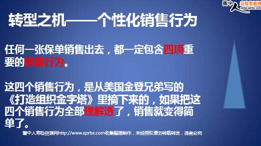 转型之机——个性化销售行为 任何一张保单销售出去,都一定包含四项重要的销售行为。 这四个销售行为,是从美国金登兄弟写的《打造组织金字塔》里摘下来的,如果把这四个销售行为全部理解透了,销售就变得简单了。 第一项销售行为:要让潜在客户同意听 你讲话,就是要设法在有利的条件下, 安排客户接受你的访谈,这叫做约访。 1、成功约访 深度思考:我的客户是否同意听我讲话,如果不同意,请检视我的行为,并马上采取改进举措让客户喜欢你。 第二项销售行为:要让潜在客户同意你 的说法,让他意识到他的确有一个问题 存在,唯有借助保险来解决,也就是让 客户承认他有保险的需要。 2、承认需求(或缺口) 深度思考:我的客户是否同意我的说法,如果不同意,请检视客户需求分析是否得当,并找到客户的保险需求或缺口(借助保单整理)。 第三项销售行为:要说服潜在客户,让 他认可眼前这位保险业务人员拥有最好 的解决方案。 3、解决方案 深度思考:我的客户是否认可我的解决方案,如果不认可,请检视我的设计初心,方案亮点,是否解决客户保险需求。 第四项销售行为:要让潜在客户愿意现 在就购买保险,从而变成正式客户。 4、马上成交 深度思考:我的客户是否马上同意成交,如果推迟成交,请检视我、我的方案、我的服务是否得到认可。