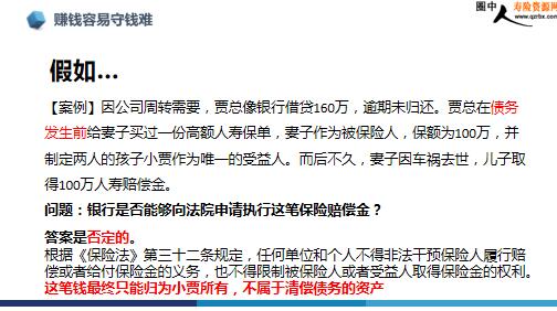 赚钱容易守钱难 赚钱容易守钱难 166万的昔日辉煌… 赚钱容易守钱难 “江南皮革厂”真的倒闭了! 2002年,那是一个夏天,在温州的工业园,江南控股集团搞了一个皮革厂。江南控股集团占江南皮革厂50%股份,集团董事长黄作兴的侄子黄鹤占10%,并且是法人代表,在几年后更是全权经营了江南皮革厂。这江南皮革厂2010年销售额3.41亿元,利润3425万元。当年在台州临海开了个新厂,两个厂产值五个亿,直到黄鹤跑路之前经营状况都十分良好。2011年4月4日,江南皮革厂贴出了清明节放假一天的告示,而董事长黄鹤还在人前镇定自若谈笑风生。可第二天,黄鹤却忽然人间蒸发,不知所踪,至今下落不明。 图片资料来源于《百度百科》 赚钱容易守钱难 浙江慈溪市达能集团董事长王银达,曾经身价数亿,然而从15年开始,由于企业经营、家庭纠纷等多方面的问题,他背上了4亿的债务,19年3月,占地300亩的达能工业园区被法院拍卖,他彻底破产,2019年4月18日,王银达收到一份资产管理公司的民事诉讼状,要求其偿还本金加利息8800多万元。王银达苦笑着说:“我有多少债要还,具体数目我也不清楚。前妻离婚后,把所有账目都带走了,我一直在想尽各种办法要回来,甚至想起诉她,但是我女儿在她那边,女儿还小,我不忍心。” 图片资料来源于东南财富网专题报道 赚钱容易守钱难 他们都忽略了一个最关键的问题: 他们当初所拥有的资产全部是 “企业性资产” 而“个人资产” 他从来就没有拥有过! 赚钱容易守钱难 货币证券 专利技术 投资权益 当企业或生意遭遇“商业纠纷”: 赚钱容易守钱难 贾跃亭的案例 2017年7月,上海招商银行川北支行因乐视旗下的乐风移动贷款发生欠息,要求法院冻结贾跃亭夫妇12.37亿资产,法院予以支持。乐视网7月4日晚公告透露,其控股股东贾跃亭所持乐视网26.27%的股权中已有99%被司法冻结,冻结时间为自冻结之日起三年,究其原因,因贾跃亭为乐视手机业务融资承担个人连带担保引发的财产保全所致。 图片资料来源于新浪财经 赚钱容易守钱难 假如… 【案例】因公司周转需要,贾总像银行借贷160万,逾期未归还。贾总在债务发生前给妻子买过一份高额人寿保单,妻子作为被保险人,保额为100万,并制定两人的孩子小贾作为唯一的受益人。而后不久,妻子因车祸去世,儿子取得100万人寿赔偿金。问题:银行是否能够向法院申请执行这笔保险赔偿金? 答案是否定的。根据《保险法》第三十二条规定,任何单位和个人不得非法干预保险人履行赔偿或者给付保险金的义务,也不得限制被保险人或者受益人取得保险金的权利。这笔钱最终只能归为小贾所有,不属于清偿债务的资产