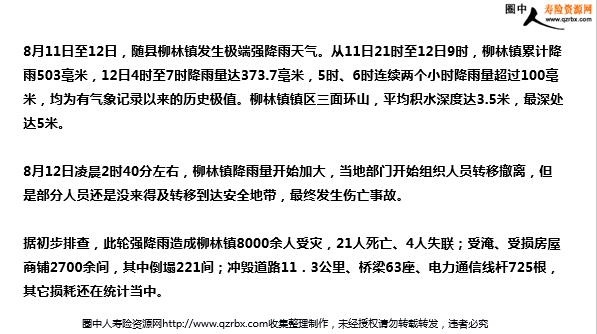 湖北随县柳林镇遭遇极端强降雨:已致21人遇难,4人失联! 8月11日至12日,随县柳林镇发生极端强降雨天气。从11日21时至12日9时,柳林镇累计降雨503毫米,12日4时至7时降雨量达373.7毫米,5时、6时连续两个小时降雨量超过100毫米,均为有气象记录以来的历史极值。柳林镇镇区三面环山,平均积水深度达3.5米,最深处达5米。 8月12日凌晨2时40分左右,柳林镇降雨量开始加大,当地部门开始组织人员转移撤离,但是部分人员还是没来得及转移到达安全地带,最终发生伤亡事故。 据初步排查,此轮强降雨造成柳林镇8000余人受灾,21人死亡、4人失联;受淹、受损房屋商铺2700余间,其中倒塌221间;冲毁道路11.3公里、桥梁63座、电力通信线杆725根,其它损耗还在统计当中。 前有河南强降雨导致灾害还在重建,如今湖北又遭受暴雨重击,人身安全和财产安全如今是头等大事。 在河南暴雨救灾当中,保险行业一直冲在前面,面对自然灾害,保护群众人身及财产安全,保险业义不容辞! 截至8月10日,河南暴雨灾害后保险业共接到理赔报案50.14万件,初步估损114.49亿元,已决赔付25.76万件,已决赔款40.14亿元。全险种金额结案率达到35.06%,其中,车险的件数结案率和金额结案率均已超50%;农险全损秋粮作物赔付9145.96万元,赔款进度为97.89%。 保险行业在一次又一次的重大事故面前,承担了自己的责任,使自己的形象更加光彩夺目!我们也应该早日破除对保险行业的偏见,信任保险,尽早给自己一份保障! 人和自然之间的较量,从古至今,却一直处于下风,尽可能逃避,降低损失,这是抗衡自然唯一能做的。 而保险,能在最无助的时候给你一份保障。最大程度的降低你的损失。 近期自然灾害频发,我们每个人都在为了自己的生活而忙碌奔波,面对随时可能发生的意外,我们更应该尽早做好规划。 意外能轻易的击垮一个温馨幸福的家庭,当风险真的发生时,你就知道什么才叫现实! 一个家庭所面对的风险是无法预知的且巨大的,如果平时没有保障,需要的时刻也只能望洋兴叹,面对可能的意外,我们需要做好准备。