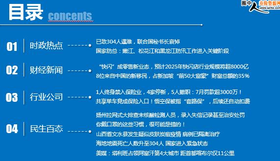 每日新闻速递 2021年8月16日 星期一 目录 时政热点 财经新闻 行业公司 民生百态 已致304人遇难,联合国秘书长哀悼 国家防总:嫩江、松花江和黑龙江防汛工作进入关键阶段 “快闪”成零售新业态,预计2025年快闪店行业规模将超8000亿 8位来自中国的新移民,占新加坡“前50大富豪”财富总额的35% 1人终身禁入保险业,4家停新,5人撤职:7月罚款超3000万! 共享单车竟成保险入口!悟空保被指“套路保”,后续还自动扣费 扬州拉网式大排查未核酸检测人员,录入失信记录甚至治安处罚 你戴口罩的这些习惯,很可能是错的! 山西省文水县发生疑似皮肤炭疽疫情 病例已隔离治疗 海地地震死亡人数升至304人 国家进入紧急状态 美媒:塔利班占领阿富汗第4大城市 距首都喀布尔仅11公里 时政热点 已致304人遇难,联合国秘书长哀悼 2021年08月15日 11:18 来源:环球时报 据中国地震台网测定,北京时间14日20点29分,海地西部地区发生里氏7.3级地震,震源深度10公里。震中位于海地西部尼普斯省,距离海地首都太子港约150公里,太子港有强烈震感。 海地民防部门表示,目前地震已造成304人死亡、至少1800人受伤,伤亡人数可能进一步上升。海地总理阿里埃尔•亨利 14日表示,这次地震是一次重大人道主义灾难,海地多地遭受巨大损失,政府宣布该国进入为期一个月的紧急状态,并动员一切资源救灾。 国家防总:嫩江、松花江和黑龙江防汛工作进入关键阶段 2021-08-14 22:49 来源: 界面新闻 据水利部门2021年8月14日通报,预计未来24小时,嫩江同盟至大赉江段、松花江肇源及木兰江段、黑龙江黑河至抚远江段、太湖等维持超警超保;江西昌江、浙江钱塘江部分江段可能超警。 据气象部门预测,未来三天,西南地区东部和南部、江南大部、华南沿海等地有明显降水,其中,最强时段为14日白天至夜间;新疆北疆西部、华北北部、东北地区南部等地有小到中雨,局地有大雨。此外,据自然资源部门预测,未来72小时,贵州东南部局部、西藏东南部局部发生地质灾害的可能性大。