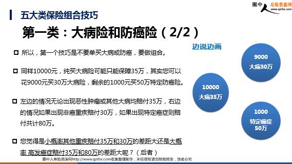 五大类保险组合技巧 转介秘籍 五大分类讲理念一键直通组合单为什么做个人组合?因为不知道哪种风险先来为什么做家庭组合?因为不知道风险先找到谁为什么做长短组合?因为不知道风险何时会来 人人都说组合好,偏偏就是成不了不愿——不找麻烦,要买什么就卖什么 不敢——客户误解,为收入而推销更多 不会——即使组合,客户也会择一而买我懂我才买,我只买我懂 常见难题 适当寒暄:我明白您的顾虑/我觉得这个理念挺对的。 吸引注意:但其实与其他行业一样,保险业的水也是蛮深的。 以退为进:我建议您深入了解一些保险“内幕”和规律以后再做决定。 减压邀约:买不买没关系,多了解多比较比较,对您一定是更好的,大概30分钟就够了,您明天下午还是后天下午方便? 首先破题 破题要点 内幕、水深、买不买没关系、30分钟 科普心态,强调一定面谈,敲定面谈时间 关键词语 关键动作 五大分类 第一类:大病险和防癌险第二类:终身型和定期型第三类:返还型和消费型第四类:给付型和报销型第五类:服务型和产品型 第一类:大病险和防癌险(2/2) 所以,第一个技巧是不要单买大病或防癌,要做组合。 同样10000元,纯买大病险可能只能保障35万,其实您可以花9000元买30万大病险,剩余的1000元买50万特定防癌险。 左边的情况无论出现恶性肿瘤或其他大病均赔付35万,右边的情况如果出现非癌重疾赔付30万,如果出现特定癌症则赔付共计80万。 您觉得是小概率其他重疾赔付35万和30万的差距大还是大概率高发癌症赔付35万和80万的差距大呢?(后者) 9000 大病30万 1000 特定癌症50万 10000 大病35万 边说边画 要点提示:点线面式组合技巧 明确一个数据 突出一项优势 牢记几个险种 平均七成、女性占比更高 大病全、癌症高大饼加油条,好吃又实惠大病加防癌,好用又不贵第二类:终身型和定期型(1/2) 明确两个时期 确认两种需求 养老期责任期 医疗费用支出收入损失补偿 第二个规律:保险从保障时间上讲,分为终身型和定期型(其中又包括中短期和一年期) 您觉得不考虑保费的情况下哪个更好?【终身】 您觉得相同保障额度下哪个更贵?【终身】 如果只能买一种您更倾向于哪种?【终身/定期】 您觉得一个人什么时候生病对家里影响大?35岁or75岁?【35岁】