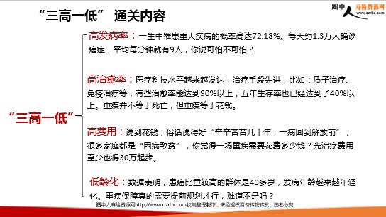 重疾险销售逻辑冰山图 目录 课程目标 了解重疾险销售逻辑掌握销售方法边画边讲挖掘保额需求提升件均充分利用人脉资源提高件数收入提高晋升留存不懂重疾险销售逻辑没有销售技巧勉强销售小额的人情保单浪费客户资源人脉枯竭没有信心渐渐流失新人存在的问题 新人学习的收获 课程目标 重疾险销售逻辑 (三高一低) (冰山图) (产品组合) 轻松切入,重疾理念 --三高一低 “三高一低” 轻松切入重疾三高一低切入重疾 2020年新发癌症患者457万人 每天1.3万人被确诊为癌症 一生中罹患重大疾病的概率为72.18% 每分钟9个人被确诊为癌症 注:数字来源于2020年中国肿瘤年报 中国 发病率越来越高 三高一低--高发病率 全球癌症发病人数逐年上升世界卫生组织最新公布数据表明,2020年全球范围内约有1929万癌症新发病例和996万癌症死亡病例,占全球每年死亡总人数近六分之一。 发病率越来越高 中国癌症发病率、死亡率均为全球第一 2020年我国新增癌症病例457万例,占比24%;死亡病例300万例,占比30%。 三高一低--高发病率 柳青乳腺癌滴滴出行总裁 朱迅血管癌央视著名主持人 随着医疗技术的发达,治愈率达50%李宗伟鼻癌世界羽毛球四大天王之一 治愈率越来越高 三高一低--高治愈率 有效的治疗技术及药物被投入使用,治疗方式先进。比如:微创手术、靶向治疗、质子治疗、免疫治疗等,质子重离子治愈率高达90%。 治愈率越来越高 重疾五年生存率逐年提升。国务院发文:2022年癌症5年生存率不低于43.3%。 三高一低--高治愈率 注:相关数据来自东方头条 重疾等于花钱,重疾治疗费用30万+治疗费用越来越高 三高一低--高费用率 重疾发病年龄趋于年轻化,40岁左右群体比重最高