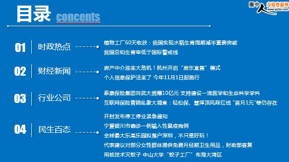 每日新闻速递 2021年8月23日 星期一 目录 时政热点 财经新闻 行业公司 民生百态 植物工厂60天收获:我国实现水稻生育周期减半重要突破 我国总和生育率低于国际警戒线 房产中介迎来大危机!杭州开启“房东直售”模式 个人信息保护法来了 今年11月1日起施行 泰康保险集团向武大捐赠10亿元 支持建设一流医学和生命科学学科 互联网保险营销乱象大调查:轻松保、慧择顶风踩红线 "首月1元"等仍存在 开封发布停工停业紧急通知 宁夏银川市确诊一例输入性鼠疫病例 全球最大乐高乐园拟落户深圳,不只是好玩! 代表建议对部分女性群体提供免费月经期卫生用品,财政部答复 用核技术灭蚊子 中山大学“蚊子工厂”布局大湾区 时政热点 植物工厂60天收获:我国实现水稻生育周期减半重要突破 2021-08-22 07:47 来源:环球时报 近日,中国农业科学院都市农业研究所植物工厂创新团队与中国水稻研究所钱前团队合作,在植物工厂环境下成功实现水稻种植60天左右收获的重要突破,将传统大田环境下120天以上的水稻生长周期缩短了一半。这为加速作物育种提供了新的技术途径。 我国总和生育率低于国际警戒线 2021-08-22 10:19 来源:成都商报社 据央视网快看官方微博消息,第七次人口普查数据显示,2020年中国总和生育率是1.3,低于国际社会通常认为1.5的警戒线被认为有跌入低生育率风险的可能。相关监测亦显示,中国今年的出生人口和生育水平仍然呈现走低趋势。分析认为,生养教成本高是不想生育的重要因素。