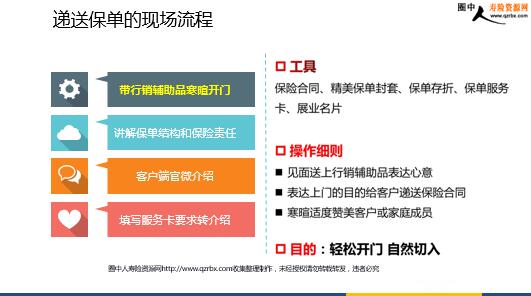 保单递送转介绍 目录 递送保单的意义 递送保单的步骤 获取转介绍的方法 递送保单的意义 课程导入 一次性消费还是可再生资源 事实上,多数新人在从业之初,持有的客户资源大同小异,相差无几。区别在于你是将客户资源作为一次性消费品,还是作为可再生资源持续挖掘,不断循环地再开发? 名单就是财富 新客户名单来源分析 从图中可以看出转介绍是最主要的客户来源。 “开发十个新客户,不如维护一个老客户”。 老客户转介绍率对业绩提升有非常重要作用。 口碑的力量往往会带来连锁反应与利润成倍增加。 名单就是财富 客户转介绍是新客户名单的主要来源 熟练运用转介绍会让我们的客户源源不断 递送保单的目的 寒暄开门 明确合同内容 建立 信任感 为重复销售 做好准备 索取 转介绍 服务客户+转介绍=下一次销售的开始 递送保单的意义 标准化、规范化展现我们的专业 客户感受更加良好,体现个性化服务 保单递送是下一次销售的开始 递送保单的步骤 递送保单的前期准备 检查核对合同 填写客户档案 准备保单封套和保单存折 附上展业名片 携带服务卡 递送保单的约访 演练谈话内容 递送保险合同 电话或微信约访 确定见面时间和地点 带上贴心行销辅助品 客户服务卡 专业服务 随时要求转介绍 温馨提示:借助递送合同的机会要求见面,并再次做好客户服务,为加保和转介绍做好铺垫。