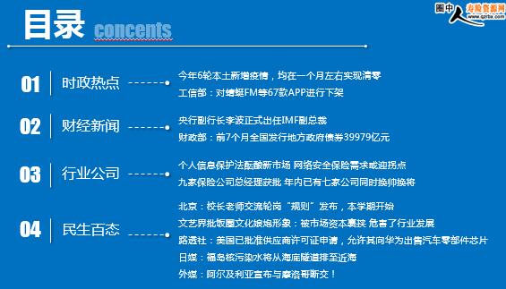 每日新闻速递 2021年8月26日 星期四 目录 时政热点 财经新闻 行业公司 民生百态 今年6轮本土新增疫情,均在一个月左右实现清零 工信部:对蜻蜓FM等67款APP进行下架 央行副行长李波正式出任IMF副总裁 财政部:前7个月全国发行地方政府债券39979亿元 个人信息保护法酝酿新市场 网络安全保险需求或迎拐点 九家保险公司总经理获批 年内已有七家公司同时换帅换将 北京:校长老师交流轮岗“规则”发布,本学期开始 文艺界批饭圈文化娘炮形象:被市场资本裹挟 危害了行业发展 路透社:美国已批准供应商许可证申请,允许其向华为出售汽车零部件芯片 日媒:福岛核污染水将从海底隧道排至近海 外媒:阿尔及利亚宣布与摩洛哥断交! 时政热点 今年6轮本土新增疫情,均在一个月左右实现清零 2021-08-25 10:01:01 来源:正观新闻 健康时报记者根据各地通报梳理发现,截至8月23日,今年我国共发生6轮局部跨地区传播的新冠疫情。从首例本土确诊病例出现,到疫情有效控制,本土确诊病例零新增,每一轮疫情用时长短不一,用时最短的仅用了13天,最长的用了34天。 从而可以看,每当新一轮本土疫情发生后,我国各地疫情防控反应迅速,基本用一个月左右时间可以有效控制疫情。 工信部:对蜻蜓FM等67款APP进行下架 2021-08-25 10:19 来源:同花顺财经 近期,工信部重点针对APP违规索取权限、开屏弹窗信息骚扰用户等问题进行了“回头看”,对仍存在问题的APP进行了公开通报。截至目前,尚有蜻蜓FM等67款APP未按时限要求完成整改。依据《网络安全法》等法律要求,工信部组织对上述67款APP进行下架。