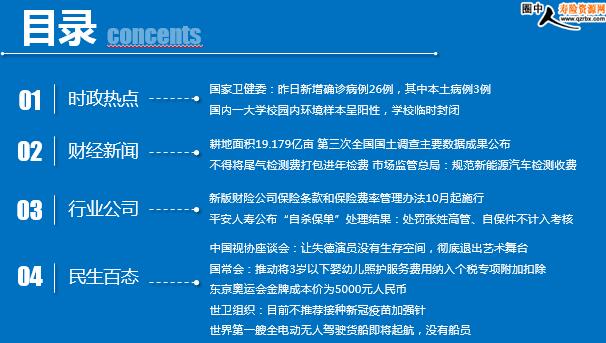 每日新闻速递 2021年8月27日 星期五 目录 时政热点 财经新闻 行业公司 民生百态 国家卫健委:昨日新增确诊病例26例,其中本土病例3例 国内一大学校园内环境样本呈阳性,学校临时封闭 耕地面积19.179亿亩 第三次全国国土调查主要数据成果公布 不得将“尾气检测费”打包进年检费 市场监管总局:规范新能源汽车检测收费 新版财险公司保险条款和保险费率管理办法10月起施行 平安人寿公布“自杀保单”处理结果:处罚张姓高管、自保件不计入考核 中国视协座谈会:让失德演员没有生存空间,彻底退出艺术舞台 国常会:推动将3岁以下婴幼儿照护服务费用纳入个税专项附加扣除 东京奥运会金牌成本价为5000元人民币 世卫组织:目前不推荐接种新冠疫苗加强针 世界第一艘全电动无人驾驶货船即将起航,没有船员,电池容量是电动车的1000倍 时政热点 国家卫健委:昨日新增确诊病例26例,其中本土病例3例 2021-08-26 10:01:01 来源:环球网 8月25日0—24时,31个省(自治区、直辖市)和新疆生产建设兵团报告新增确诊病例26例,其中境外输入病例23例(广东9例,云南7例,上海3例,天津1例,辽宁1例,浙江1例,福建1例),本土病例3例(均在云南);无新增死亡病例;新增疑似病例1例,为境外输入病例(在上海)。 国内一大学校园内环境样本呈阳性,学校临时封闭 2021-08-26 10:19 来源:桂林生活网 8月25日上午,有消息称位于北京市朝阳区大屯路的中国科学院大学奥运村校区已临时封闭,目前有多辆警车停在附近,大门确实有警务人员负责维持秩序,禁止人员出入。现场有救护车进入,同时也有身穿防护服的工作人员组织开展核酸检测。 随后,就中科院大学奥运村校区封闭管理一事,记者向属地奥运村街道办事处了解情况,工作人员称情况属实。此前在校园内环境监测样本中发现一处点位为阳性,目前正在进行全员核酸检测,人员未发现阳性。由于人员较多目前检测还在进行当中。