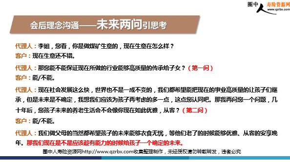 养老社区活动配套销售逻辑养老社区活动销售逻辑 未来两问攒钱三问生活三选 参加养老社区活动优势: 实地参观,让客户身临其境体验xx养老社区,见证xx品牌实力 养老社区参观活动,环境优美,活动安排紧凑有序,客户体验好。 客户参观后,一致好评,即使不签单也会成为xx养老社区的宣传 中心,自发向朋友推荐,成为日后的转介绍中心。 活动后养老理念沟通,客户更容易接受,易促成,可高效签单。 代理人:李姐,现在是我们公司为大客户准备的一年一度参观养老社区的时间段,xx 养老社区遍布全国,以前我也跟您提过,邀请您来参加。客户:现在疫情期间,方便参观么? 代理人:今年因为疫情的原因,更是为了更好的服务xx当地客户,我们在xx有一个养老社区可以体验,我手中有一个参观名额,我的客户暂时没在xx省内,我觉得这个名额给您才是不浪费,您跟我去参观呀,既能看看我们未来的养老生活,又能散散心,当天往返,我们的服务人员和受邀请的客户都是经过严格行程检查的,您放心吧! 按照公司活动流程体验养老社区 未来两问引思考 攒钱三问引共鸣 会后理念沟通加深客户理解,方便进一步促成 会后理念沟通 生活三选你做主 代理人:李姐,您看,你是做煤矿生意的,现在生意在怎么样?客户:现在生意还不错。 代理人:那您能不能保证现在所做的行业能够高质量的传承给子女?(第一问)客户:能/不能。 代理人:现在社会发展这么快,世界也不是一成不变的,我们都希望能把现在的事业高质量的让孩子们继承,但是未来是不确定,我想我们应该为孩子再考虑的多一点,这点您认同吧。那我再问您一个问题,几十年后,您孩子未来的养老生活会不会像你现在如此优雅,从容?(第二问)客户:能/不能。 代理人:我们做父母的当然都希望孩子的未来能够衣食无忧,等他们老了的时候能够优雅、从容的安享晚年。那我们现在是不是应该趁有能力的时候给孩子一个确定的未来。 代理人:李姐,您生意做得这么大,资产雄厚,那您平时有没有攒钱的习惯?(第一问) 客户:当然有,中国人不就是肚里有粮心不慌么,有再多资产也有攒钱的习惯。 代理人:那您用什么方式攒钱,现在收益如何?(第二问) 客户:我一般把不用的钱存银行,但不知道为什么没有攒下,每年利息取出来花了,几年后发 现还是那些没有增长,要是买车买房子,就更攒不下了。 代理人:如果有专人专项为您打理账户帮您攒钱,还可以让您攒下的钱保值增值,你需要吗? (第三问) 客户:如果有专业的人,能够让我的前保值增值,我当然需要了。 代理人:李姐,现在如果您选择xx,就相当于有专人帮您打理,您也拥有一个机会,每个月积累的这 笔钱能够复利增额,让您或者您的孩子享受未来确定的品质养老。前些天,我陪妈妈去公园锻炼身体,看到 了3种不同的老年生活,颇有感触,跟您分享一下。第一种:老年生活很自由,想干什么想去哪都随心情, 花钱不用精打细算,这样的老人,最起码应该有丰厚的养老金,月养老金应该不低于3万(数字各地区略有差 别,请根据当地经济条件进行调整)。第二种:一个月养老金仅四五千,为了省保姆费,在家带孙辈,操心劳累。 第三种:没有养老金,靠子女养。其实这三种都是未来可能出现的养老现状,我们当然希望自己的孩子过第 一种养老生活,您说对吧。 客户:那当然了。