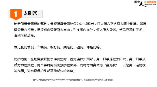 六大生命要害一定要护好 这是颅骨最薄弱的部分,骨板厚度最薄处仅为1—2毫米,且太阳穴下方有大脑中动脉。如果遭受暴力打击,易造成血管破裂大出血,引发颅内血肿,使人陷入昏迷。伤后应及时手术,否则可能致命。 常见受伤情况:车祸伤、殴打伤、跌落伤、砸伤、冲撞伤等。 防护措施:在地震或踩踏事件发生时,首先保护头颈部,用一只手捂住太阳穴,另一只手从后方护住颈椎,两个手肘向前夹紧护住面部,同时弯曲身体为“婴儿状”,以起到一定的缓冲作用。这也是保护头部其他部位的姿势。 太阳穴 里面有呼吸心跳中枢脑干,它负责维持心跳、呼吸、消化、体温、睡眠等重要生理功能,可以说是“生命中枢”。后脑勺的颅骨相对薄弱,如遭重创,也会引发颅内血肿致命。 常见受伤情况:车祸伤、殴打伤、跌落伤、砸伤、跌倒伤等。 防护措施:大脑是人体极为重要的器官,缺氧4分钟即可造成脑细胞死亡。因此,外出散步、活动、游玩时,应尽量远离高层建筑群,少在陡峭的山壁下行走或停留,防止被坠落物或滚石砸伤。防护姿势同上一条。 若不幸头部受伤,一定要尽快去医院做头部CT,排除颅内血肿。有的头外伤患者短暂昏迷后会清醒,然后再度陷入昏迷,这有可能是颅内出血的前兆;有的头外伤没有表皮伤,但也不能掉以轻心,应及时就医,否则,一旦颅内出血再去医院就来不及了。 后脑勺 这是人体最脆弱的神经中枢“走廊”,一旦严重损伤即可致命。据统计,颈椎损伤并发脊髓损伤率死亡率可达15%—20%。尤其高位颈椎骨折,易造成呼吸心跳骤停。另外,气管受伤,容易造成窒息;喉结旁边的颈动脉受伤,则易因失血过多致死。 常见受伤情况:车祸伤、刀伤、跌落伤、运动伤等。单双杠、滑冰、滑板、跳水、舞蹈等较易伤害颈椎。 防护措施:每逢夏季,游泳的人因跳水时头部撞击障碍物,引起颈椎骨折的事故时有发生。所以,在不熟悉深浅的水域和提示禁止跳水的水域一定不能“扎猛子”。