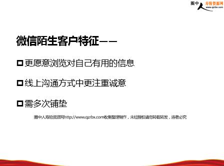用微信开拓客户 一、客户特征和来源二、微信开拓客户三、跟进和促成加保 借助工作日志整理客户信息,定期沟通—— 进入行业第一天就坚持每天写工作日志,高效且随时随地掌握客户信息保证每天都有访量,随时随地可沟通,严把拜访质量微信陌生客户特征—— 更愿意浏览对自己有用的信息线上沟通方式中更注重诚意需多次铺垫名单收集要点—— 必备动作:在各大群中发送保险相关知识关注对象:有回应、感兴趣的客户,群中常说话的人后续沟通:大胆介绍,靠保险知识科普持续联系 必备动作—— 消息内容:各类保险知识科普,常用一:xx 400万高端医疗,啥保险不买!这个必须买一年最低152元,保障400万的xx医疗,不用体检,只要身体健康优势一:不论大病小病还是意外,只要住院就可以赔,无病种限制优势二:交费低,保障高,xx看病更安心优势三:什么药都报销,不论是国产药/还是进口药;社保不报销的费用,全部都赔都报销优势四:下列费用全部都赔都报销:(1)药品费(含进口药,自费药)(2)治疗费(3)手术费(4)护理费(5)膳食费(6)床位费(7)检查化验费 优势五:全国范围住院二级及以上公立医院均可理赔,不受地域限制!优势六:可以续保至99岁。优势七:每年可高达200万一般医疗金,400万重疾医疗金优势八:患重大疾病提前给5万元治疗费,花多少报多少,100%报优势九:质子重离子医院也报销,100%报一年只需几百块钱。患病不一定要命,但一定要钱,远离贫困,从一份保障开始!联系电话:xxx (8)质子重离子治疗费100%报销(9)医生诊疗费(10)肾透析治疗费(11)器官移植后门诊抗排异治疗费(12)恶性肿瘤食疗费(13)门诊手术费 必备动作—— 消息内容:各类保险知识科普,常用二:重疾险产品组合 总共管172种疾病,以20万保额为例保障利益如下: 一:管重疾: 1、轻症32种,每种赔6万,可赔5次,共30万 2、中症20种:每种赔12万,可赔2次共计24万 3、重疾:120种,每种赔20 万,可赔5次共100万 4、恶性肿瘤:每次赔20 万,可赔3次共60万 5、脑中风后遗症:每次赔20万,可赔3次共60万 6、急性心肌梗死:每次赔20万,可赔3次共60万 7、寿险复原金:重大疾病赔付20万,1年后身故时再赔20万 8、身故或全残:赔20万 9、轻症、中症、重疾只要得其中一种,后期保费免交,合同继续有效 二:管报销 10、住院一天补助100元,一年可以补助180天,共18000元 11、意外门急诊每年报销5000元 12、住院每年能报400万,如果得重疾提前给5万,100%报销 一、客户特征和来源二、微信开拓客户三、跟进和促成加保 认可保险的客户—— 通过三讲展开话题,注意逻辑:讲产品、讲自己、讲公司 讲产品—— 讲保险责任和保险法,切入产品手写产品责任拍照发给客户,承诺拿到合同后,送出合同时再次进行讲解,在全额退款,用笔标出合同中的重点,展现个人专业技能,提高客户信任度讲自己—— 通过专业度,引起客户了解自己的好奇心,找有代表性照片发给客户,集体或个人照,照片背景有自己名字,每一年的活动都发拉近与客户的距离,称呼慢慢从xx变成xx 一、客户来源和特征二、微信开拓客户三、跟进和促成加保 跟进要点—— 注意时间上不要太过拖沓,根据客户每一句的反馈状态进行进一步的沟通要相信纯线上签单的可能性,持续跟进很重要,不要给自己设置思想阻碍,可自然沟通后续加保线上客户签单加保案例 70岁,李女士,从xx开始聊,2020年2月给外孙购买xx加重大疾病 x年x月,李女士女儿购买重疾和养老,沟通防癌险和重疾的区别 x年开门红再讲理财,给外孙一笔养老金和教育金