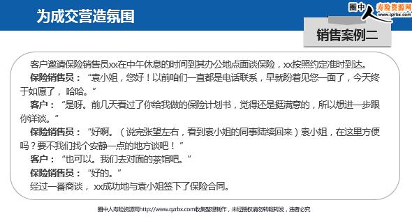 销售技巧之为成交营造氛围 为成交营造氛围 销售案例小结 为成交营造氛围 提到氛图,很多人会觉得它很虚、很抽象,但是它所起的作用却是巨大的。保险销售员到了签单的关键环节也需要营造一定的氛围才能成交。试想,如果在一个混乱、嘈杂的环境当中,客户怎么能集中注意力和保险销售员商谈保险呢? 为成交营造氛围 在营造成交氛围的时候,保险销售员可以从交谈的内容、形式、地点等方面着手。