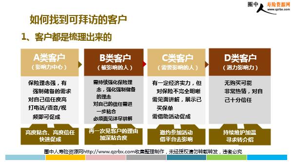 业绩来源于勤奋拜访 是客户源源不断的核心 是精进逻辑最好的方法 是保持状态最有效的良药 是自然产生大单的来由 A类客户(影响力中心) B类客户(被影响的人) C类客户(需要影响的人) D类客户(潜力影响力) 需持续强化保险理念,强化强制储备的理念对自己的信任需进一步粘合必须面见详尽讲解 再一次见客户的理由加深粘合度 有一定经济实力,但对保险不完全明晰需见面讲解,展示已买保单需借助活动促成 邀约参加活动借平台去影响 无购买可能非常热情,对自己十分信任 持续维护加温寻求转介绍 保险理念强,有强制储备的需求对自己信任度高打电话/语音/视频即可促成 高度粘合、高度信任快速促成 如何找到可拜访的客户 1、客户都是梳理出来的 只要迈开腿张开嘴,不停拜访,就有客户 线上获取:微信好友每日经营至少10人老客户转介绍:个人/公司活动老带新交叉聚餐:互相邀请到对方家里聚餐 老客户所在地:到老客户店里捧场特定场所:茶馆、美容院、理发店等 规划出来的 随机的产生的 2、客户是规划出来的,也可以是随机产生的 每日20访(确保有效4访)边蓄边促 3、客户是经营出来的 海量开口广而告之边蓄边促,才能有源源不断的客户,才能有源源不断的签单。 如何去拜见客户 1、客户群体分类对应精准逻辑 80/90后 精准逻辑:上有老下有小的群体,有房贷车贷,需要建立家庭的财富框架,xx为房贷车贷上了一份保险;也是待经济形势转好后的一笔启动投资资金。 70后 精准逻辑:人本来是无价的,但是养老现状逼得我们需要提前给自己定价,xx让我们的养老更有品质,更有尊严。 孩子 精准逻辑:xx可以是给孩子的教育金,教会孩子从小养成攒钱的习惯,传递爱的同时更是教会孩子什么是“责任” 一通电话 一件小礼物 一句开口逻辑 一个平台 2、与客户见面做到”五个一“ 一个归类 你的尽心和精心, 才能换来 客户的开心 必须讲三句话逻辑不停的拜访和讲解,形成连客户都能复制出来的三句话逻辑。 必须做一个促成今天谈得差不多的客户,今天就必须收回来,收回来的单子提醒客户必须立马承保。 必须做一个转介绍要求已签单客户要求转介绍认识的朋友;还在考虑中的,询问客户觉得哪些群体适合xx,要求转介绍。 3、与客户见面做到”三必须“ 每天十块钱买不了吃亏买不了上当,但是却能首先攒下一笔钱,而且资金安全、投取灵活。更重要的是复利3.5%不断增额,提升身价。有生之年花钱不愁,有朝一日与上帝下棋,留下一笔财富后代受益,这就叫责任,这就叫价值。 如何保持最好的拜访状态 勤奋拜访让自己保持激情满满: 自己的行动和持有的状态,会影响团队的状态,也会影响客户对你的态度。 勤奋拜访已将产品深刻在脑子里: 时时刻刻在想着产品,看到的任何事物都能跟xx扯上关系,都能跟客户扯上关系。