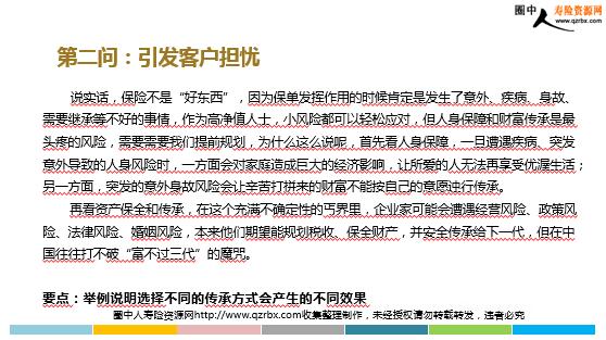 顾问式销售法助力高保额销售 收入保障 全残保障 失能护理 家人呵护子女教育 降低遗产总额 移产及移权 税金来源 指定传承 意义 终身寿高保额的价值及意义 高端客户的共性: 时间对于他们来说特别宝贵,他们喜欢高效、简洁的沟通。 将需求面谈及成交面谈相结合的顾问式销售流程,能最大程度地节省客 户时间,简单高效地为其提供高品质的专业服务。 要点:面访前要准备充分,因为高端客户只会给我们一次展现专业的机会, 所以面谈前的充分准备至关重要,这会直接决定最终效果。 第一问:切入保障需求 “为了更好地为您的家庭量身定做保障计划,请您如实地介绍一 下您的家庭情况,好吗?” 要点:很多人担心客户不太愿意如实告知家庭情况,其实越高端的客户越尊重专业、认 同专业,他们认为专业的事情应该交给专业人士去打理。面对能为其提供风险保障的专业人士,他是会如实告知其家庭及企业情况的。 无论我们对他的状况了解得有多清楚,都应该请客户自己来介绍,这样有利于营造 轻松的谈话氛围,了解客户的真实需求。 第二问:引发客户担忧 说实话,保险不是“好东西”,因为保单发挥作用的时候肯定是发生了意外、疾病、身故、需要继承等不好的事情,作为高净值人士,小风险都可以轻松应对,但人身保障和财富传承是最头疼的风险,需要需要我们提前规划,为什么这么说呢,首先看人身保障,一旦遭遇疾病、突发意外导致的人身风险时,一方面会对家庭造成巨大的经济影响,让所爱的人无法再享受优渥生活;另一方面,突发的意外身故风险会让辛苦打拼来的财富不能按自己的意愿迚行传承。再看资产保全和传承,在这个充满不确定性的丐界里,企业家可能会遭遇经营风险、政策风险、法律风险、婚姻风险,本来他们期望能规划税收、保全财产,并安全传承给下一代,但在中国往往打不破“富不过三代”的魔咒。 要点:举例说明选择不同的传承方式会产生的不同效果 第二问:引发客户担忧 保单特有的高身价保障、定向传承的法律功用可以帮助解决这些难题, 高身价保障让我们留爱不留债,定向传承是通过指定受益人的方式,严格按 照保险合同的约定给付身故保险金。更重要的是保单具有很好的保密性,保 险合同的订立一般只在当事人之间,保险金的理赔基本上也不要像遗嘱那样 必须所有继承人到场,只需要受益人到场即可。 第三问:轻松锁定保额 “您认为需要多少资金才能解决您当下的担忧?” 要点:尽量不要帮高端客户确定保额,因为我们会不自知地用自己的口袋去衡 量客户的口袋,根本无法满足客户需求。最好让他说出他解决问题需要的资金, 这就是他真实的保额需求,这样会让保障计划落地更容易。 第四问:精准匘配保额 “那这些资金您想要怎样分配?是在您一个人身上,还是平分,或者按比例?” 要点:很多高端客户的企业股权、婚姻状态比较复杂:有夫妻或者是兄弟姐妹共同创办企业的, 也有几个合伙人一同创办企业的;而婚姻状况就更不用说了,很多高端客户家庭都有好几个孩子。当婚姻家事及企业股权、财富分配相结合时,我们既要能给客户提供专业服务,又要能引导 客户郑重思考家庭关系、情感关系、财富关系,仅而帮助他们理性地捍卫亲情。