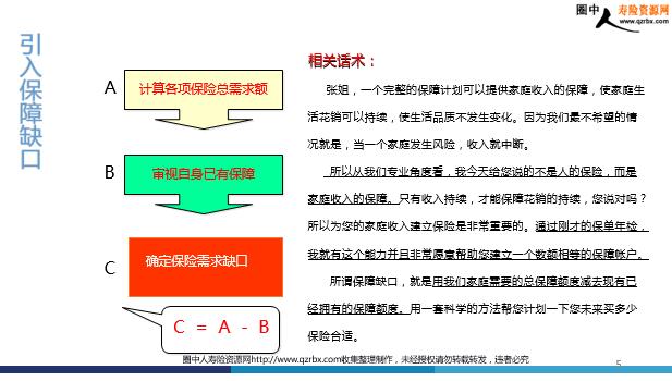 人生7张保单 销售七张保单之一个活动 业务员需要 客户需要 为什么做保单体检 相关话术:张姐,一个完整的保障计划可以提供家庭收入的保障,使家庭生活花销可以持续,使生活品质不发生变化。因为我们最不希望的情况就是,当一个家庭发生风险,收入就中断。所以从我们专业角度看,我今天给您说的不是人的保险,而是家庭收入的保障。只有收入持续,才能保障花销的持续,您说对吗?所以为您的家庭收入建立保险是非常重要的。通过刚才的保单年检,我就有这个能力并且非常愿意帮助您建立一个数额相等的保障帐户。所谓保障缺口,就是用我们家庭需要的总保障额度减去现有已经拥有的保障额度。用一套科学的方法帮您计划一下您未来买多少保险合适。 引入保障缺口 重疾保险需求 重大疾病保险需求=经验额度-已有商业保险 保障缺口计算原理 一个普通家庭的每个家庭成员,最少应该准备20万元的重疾保障应急金。张姐,通过保单检视可以看到,我们目前已有的商业重疾保障有B,保障缺口为20万-B=C万。 相关话术 重疾保障缺口讲解 养老保险需求 养老保险需求=预计退休时的月开销×生命余额-已有商业保险 保障缺口计算原理 相关话术:我们不知道自己能够活多长时间,可以按最新的寿命表,退休后到80岁。从60岁到80岁,在退休的20年里,假如1人每顿平均10元,光吃饭夫妻俩就需要10元*3顿*365天*20年*2人=43.8万!这还不包括我们的衣、食、住、行和看病的费用。如果我们活得更久,我们就需要更多的生活成本。所以,一个普通家庭最少需要准备50万的养老补充金才行。张姐,通过保单检视可以看到,我们目前已有的商业养老保障是B,保障缺口为50万-B=C万。 养老保障缺口讲解 教育金保险需求 教育金保险需求=小孩未来求学所需教育金额-已有教育金储备 保障缺口计算原理 相关话术:孩子的健康成长,不仅仅需要父母的关爱,更需要成长过程中各个阶段所需要的费用。投资教育就是投资明天,投资孩子就是投资未来。那么到底培养一个孩子需要花多少钱?中国社科院社会学研究所最新一期的《青年研究》刊发了著名社会学家徐安琪的《孩子的经济成本》的调研报告。报告指出,0至16岁孩子的抚养总成本将达到25万元左右。如估算到子女上高等院校的家庭支出,则高达48万元!所以,对于孩子未来这么大一笔费用的支出,我们做父母的更应该提前做好规划。张姐,通过保单检视可以看到,我们目前针对孩子的专项教育金储备是B。保障缺口为48万-B=C万。 教育保障缺口讲解 人寿保险需求 人寿保险需求=家庭各项开支预估总额+父母赡养费总额+各项贷款-已有保险 保障缺口计算原理 相关话术:作为一家之主,在您的呵护下,您的家人生活得很幸福。一旦有什么闪失发生,家里边就会很被动,家庭的收入就会中断。 421倒金字塔就是中国当代社会的家庭结构图,这是您,这是您爱人,这是您的小孩,这是双方的老人。我们对上要赡养4位老人,对下要抚养小孩——现在我们承受着很大的压力!所以说,我们需要的人寿保险应该等于家庭各项开支预估总额+赡养父母的费用+抚养子女的费用+各项贷款-已有保险。