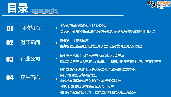 每日新闻速递 2021年9月23日 星期四 目录 时政热点 财经新闻 行业公司 民生百态 头条新闻 中秋假期国内旅游收入371.49亿元 哈尔滨市新增5例新冠肺炎确诊病例及3例新冠病毒核酸初筛阳性人员 热搜第一!花呗回应 易会满重磅发声!最高检驻证监会检察室成立加大重大违法案件查处惩治力度 险企分支机构准入门槛提高 有助减少过度竞争 银保监会官宣两大首席:刘福寿、王朝弟分别任首席风险官、首席检查官 民政部确认邯郸肥乡区等为第二批全国婚俗改革实验区 厦门2地调整为高风险地区 中秋档电影票房创四年新低 业内苦盼国庆档 阿富汗塔利班要求在联合国大会上发言 没打疫苗被拒餐厅门外,巴西总统站纽约大街上吃披萨 时政热点 中秋假期国内旅游收入371.49亿元 2021年09月22日 10:50:11 来源:人民网 本报北京9月21日电据文化和旅游部数据中心测算,2021年中秋假期3天,全国累计国内旅游出游8815.93万人次,按可比口径恢复至2019年中秋假期的87.2%。实现国内旅游收入371.49亿元,按可比口径恢复至2019年中秋假期的78.6%。 哈尔滨市新增5例新冠肺炎确诊病例及3例新冠病毒核酸初筛阳性人员 2021-09-22 14:37 来源:环球网 9月21日18时—22日12时,哈尔滨市新增5例新冠肺炎确诊病例及3例新冠病毒核酸初筛阳性人员。5例确诊病例中,有4例在巴彦县、1例在南岗区,均系9月21日3例确诊病例的密切接触者,9月21日,在重点人群新冠病毒核酸检测中初筛结果呈阳性,闭环转运至哈尔滨市第六医院。9月22日,专家组依据《新型冠状病毒肺炎诊疗方案(试行第八版 修订版)》,结合临床、影像学表现和实验室核酸检测结果,诊断为新冠肺炎确诊病例。