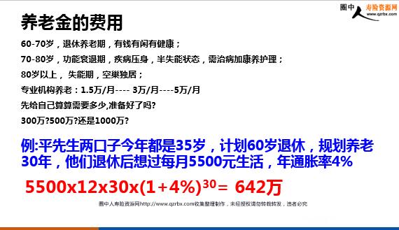 养老销售逻辑 科技发展,特效药不断问世,许多疑难杂症不断攻克(如阿尔茨海默症新药;造血干细胞;质子重离子;最近的CAR-T细胞免疫疗法—阿基伦塞药物的突破)。 生活水平提高,膳食均衡,生活有规律,注重运动; 由于健康意识的增强,越来越多的人自觉体检,疾病能够尽早发现; 很多家庭由于参加了商保,让患者找好医生、好医院、用最好的药,用最好的治疗方案已不再是幻想; 人为什么会长寿 人口结构 老龄化社会(联合国及世界银行标准):当一个国家或地区60岁以上老年人口占人口总数超过10%或65岁以上老年人口占人口总数超过7% 2016年,我国60岁以上老年人已突破2亿,占比16.7% 2020年将达到17.8%(深度),2030年将达到25%(超级)预计2050年,60岁以上人口将达到4.58亿,占比高达30% 中国社保基金2035年用完,目前部份省份养老金缺口巨大;建国后三次人口高峰:51-58年;63-76年;85-91年; 2018年,城镇职工养老保险的抚养比是2.97:1,平均不足三个人养一个人,2020年将下降2.94:1, 2050年将下降到1.3:1 60-70岁,退休养老期,有钱有闲有健康; 70-80岁,功能衰退期,疾病压身,半失能状态,需治病加康养护理; 80岁以上,失能期,空巢独居;专业机构养老:1.5万/月----3万/月----5万/月先给自己算算需要多少,准备好了吗? 300万?500万?还是1000万? 例:平先生两口子今年都是35岁,计划60岁退休,规划养老30年,他们退休后想过每月5500元生活,年通胀率4% 5500x12x30x(1+4%)30=642万 养老金的费用 与生命等长的现金流 专属的,可掌控的 安全稳定增长,跑赢通胀 养老金的特点 一、分红险是如何定价的?依据是什么?答:分红型年金险是以750天10年期国债的平均值,目前是2.8%,依据是银保监会182号文件二、德国三十年期的国债利率是多少?答:0.38% 三、日本十年期国债利率是多少?答:0% 四、最近美联储降息,世界各国纷纷跟进,中国有没有跟进?为什么?答:中国没有跟进,保持1.5%傲视全球,我国经济向好五、日本的分红型保险的定价利率是多少?答:1.5% 六、台湾的分红型保单的定价利率是多少?答:1.75% 七、什么样的资产是无风险资产?利率是多少?答:十年期国债利率是无风险资产,是以国家信用担保的,目前利率2.8% 负利率 养老靠谁? 1、经济保障面临困境2、生活照料面临困境 3、精神慰藉面临困境4、“失独家庭”养老困境更为严重 ...........
