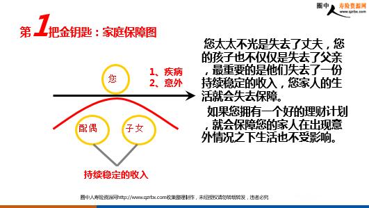 运用五把金钥匙 激发客户需求 辅导目标 1、帮助新人熟练运用五把金钥匙激发客户需求; 2、帮助新人养成边画图、边说明的良好习惯。知识点 1、五把金钥匙运用步骤; 2、五把金钥匙话术讲解; 3、保险理念沟通话术。目录 主管操作要点 课堂演练 辅导流程: 主管操作要点: 事前准备: 1、主管:《主管辅导手册》、笔、白纸; 2、新人:《新人成长手册》、《工作日志》,提前预习五把金钥匙内容; 3、预约时间、地点。 主管操作要点: 向新人讲解五把金钥匙的话术及画图要点,要求新人记录下来。重点话术:销售面谈的关键是确定客户需求,画图讲保险非常重要,可以快速的导入保险理念,有效激发客户的保险需求。而五把金钥匙就是一个经典切入工具,它是激发客户需求的重要方法。 1、主管扮演业务员、新人扮演客户,主管按照五把金钥匙话术进行示范; 2、主管在示范过程中要求学员仔细观察,记录要点; 3、主管询问新人的感受、体会,了解新人的掌握情况,解答新人的问题。 主管操作要点: 第一把:家庭保障金第二把:教育基金第三把:退休金第四把:应急资金第五把:有计划的储畜 在收集客户资料后,我们基本上可以分析出客户的需求,接下来激发和确认客户的需求就显得非常重要了。我们在以需求为导向的销售面谈中要了解和掌握的激发客户需求的工具一共有五个,统称为——五把金钥匙。其实,寿险对于客户来说,就是一串金钥匙,解决不同客户在不同时期的不同需求,我们掌握好了这五把金钥匙,就可以打开客户的心门,打开巨大的寿险市场 第1把金钥匙:家庭保障图 陈先生您是一家之主。 您 第1把金钥匙:家庭保障图 这是您的太太和子女,在您的关怀和照顾下,您的太太和孩子都生活得非常的舒适和幸福。 配偶 子女 第1把金钥匙:家庭保障图 但一个人无论多有本事有两件事是无法控制的,一个是疾病,一个是意外。 配偶 子女 1、疾病 2、意外 第1把金钥匙:家庭保障图 假如突然有一天您不能照顾他们了。 您 配偶 子女 1、疾病 2、意外 第1把金钥匙:家庭保障图
