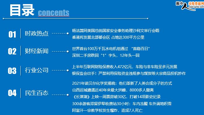 每日新闻速递 2021年10月8日 星期五 圈中人寿险资源网制作:www.qzrbx.com 目录 时政热点 财经新闻 行业公司 民生百态 杨洁篪同美国总统国家安全事务助理沙利文举行会晤 香港将发展北部都会区 占地达300平方公里 世界首台100万千瓦水电机组通过 “首稳百日” 深圳二手房跌回“1”字头,12年头一回 上半年互联网财险保费收入472亿元,车险与非车险呈多元发展 银保监会出手!严禁利用保险资金违规参与煤炭等大宗商品投机炒作 2021年诺贝尔化学奖揭晓:他们革新了人类合成分子的方式 山西运城遭遇近40年来最大洪峰,8000多人撤离 《长津湖》上映一周票房破30亿,打破14项影史纪录 300余游客滞留伊犁收费站30小时:车内冻醒 车外满地积雪 阿富汗一宗教学校发生爆炸,造成7人死亡 时政热点 杨洁篪同美国总统国家安全事务助理沙利文举行会晤 2021年10月7日 10:50:11 来源:中国日报网 当地时间2021年10月6日,中共中央政治局委员、中央外事工作委员会办公室主任杨洁篪同美国总统国家安全事务助理沙利文在瑞士苏黎世举行会晤。双方就中美关系和共同关心的国际与地区问题全面、坦诚、深入交换意见。会晤是建设性的,有益于增进相互了解。双方同意采取行动,落实9月10日两国元首通话精神,加强战略沟通,妥善管控分歧,避免冲突对抗,寻求互利共赢,共同努力推动中美关系重回健康稳定发展的正确轨道。 香港将发展北部都会区 占地达300平方公里 2021-10-6 12:54:03 来源:中新网 中新网香港10月6日电 香港特区行政长官林郑月娥10月6日发表任内第五份施政报告,当中提出建设香港北部成为宜居宜业宜游的都会区,占地达300平方公里,覆盖由西至东的深港口岸经济带及更纵深的腹地。