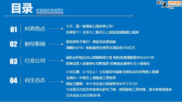 每日新闻速递 2021年10月13日 星期三 目录 时政热点 财经新闻 行业公司 民生百态 今天,第一批国家公园名单公布! 全国首个!北京为二胎及以上家庭直接配租公租房 居民用电不涨价!国家发改委明确 增幅约47%!蚂蚁集团注册资本增加至350亿元 保险业积极应对山西强降雨灾害 财险受理理赔案件约3477件 招商信诺人寿董事长刘辉离职 招商基金董事长王小青接任 3.90亿辆、4.76亿人!公安部发布最新全国机动车和驾驶人数据 全国约一半省份上调最低工资标准 国家卫健委:中小学生视力筛查每学年不少于2次 今年诺贝尔经济学奖得主研究了啥:提高最低工资有理,读书多挣钱更多 日本成功3D打印和牛肉 时政热点 第一批国家公园名单公布! 2021年10月12日 10:50:11 来源:辽沈晚报 国家主席习近平12日下午以视频方式出席《生物多样性公约》第十五次缔约方大会领导人峰会并发表主旨讲话。在讲话中,习近平宣布,中国正式设立三江源、大熊猫、东北虎豹、海南热带雨林、武夷山等第一批国家公园。 全国首个!北京为二胎及以上家庭直接配租公租房 2021-10-11 12:54:03 来源:中国城市报 10月8日, 北京市朝阳区房管局发布公告称,对于已经取得公租房备案资格,同时尚未配租配售的未成年子女数量较多的家庭,直接发放选房通知单组织选房。 首批多子女轮候家庭共175户。 北京因此成为全国首个在公租房分配中鼓励生育、落实国家“三胎”政策的城市。
