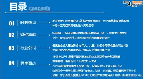 每日新闻速递 2021年10月18日 星期一 目录 时政热点 财经新闻 行业公司 民生百态 周末突发!陕西通报2名外省游客新冠阳性,为上海某高校退休教师 神舟十三号航天员顺利进入天舟三号 招商银行:招商局集团内部股权架构调整,第一大股东未发生变化 央行、银保监会评估认定19家国内系统重要性银行 银保监会发人身险新规 老年人、儿童、外卖小哥等成重点关注人群 中国平安创新数字化增员 代理人队伍提质优势凸显 1603.9公斤!袁隆平团队研发的杂交水稻双季亩产创新纪录 东海海域一渔船沉没 2人获救11人失联 2020年度国家老龄事业发展公报:全国60岁以上老人超2.6亿 陕西汉中一男子在街上强奸7旬老太,检方:应从重,建议量刑三年三个月 唏嘘!昔日浙江女首富近4000万北京房产突然被甩卖!被执行标的总额超25亿 时政热点 周末突发!陕西通报2名外省游客新冠阳性,为上海某高校退休教师 2021年10月16日 10:50:11 来源:健康陕西 “健康陕西”微博17日信息显示,10月16日0时—10月17日7时,陕西新增2例外省游客核酸检测阳性病例。10月16日0—24时,新增报告境外输入确诊病例1例、无症状感染者1例。 截至10月16日24时,累计报告本地确诊病例248例,出院245例、死亡3例。 10余省份开打新冠疫苗加强针 2021-10-17 12:54:03 来源:央视新闻 据中国载人航天工程办公室消息,在顺利进驻空间站天和核心舱后,北京时间2021年10月17日9时50分,神舟十三号航天员乘组成功开启货物舱舱门,并顺利进入天舟三号货运飞船;接下来,航天员乘组还将开启天舟二号货运飞船货物舱舱门。后续,航天员乘组将按计划开展货物转运等相关工作。