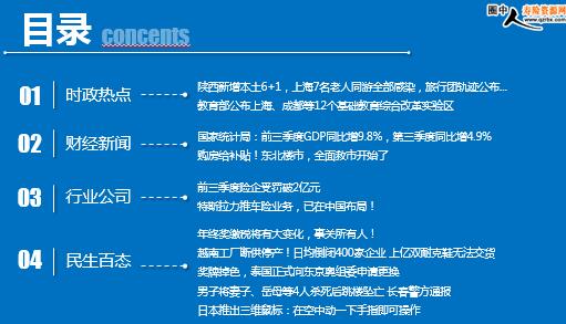每日新闻速递 2021年10月19日 星期二 目录 时政热点 财经新闻 行业公司 民生百态 头条新闻 陕西新增本土6+1,上海7名老人同游全部感染,旅行团轨迹公布... 教育部公布上海、成都等12个基础教育综合改革实验区 国家统计局:前三季度GDP同比增9.8%,第三季度同比增4.9% 购房给补贴!东北楼市,全面救市开始了 前三季度险企受罚破2亿元 特斯拉力推车险业务,已在中国布局! 年终奖缴税将有大变化,事关所有人! 越南工厂断供停产!日均倒闭400家企业 上亿双耐克鞋无法交货 奖牌掉色,泰国正式向东京奥组委申请更换 男子将妻子、岳母等4人杀死后跳楼坠亡 长春警方通报 日本推出三维鼠标:在空中动一下手指即可操作 时政热点 陕西新增本土6+1,上海7名老人同游全部感染,旅行团轨迹公布... 2021年10月18日 10:50:11 来源:每日经济新闻 陕西省卫健委18日通报,10月17日0时-10月18日7时,陕西省新增报告6例本土确诊病例(其中2例为10月17日已发布的外省游客核酸检测阳性病例)、1例本土无症状感染者。10月17日0-24时,新增报告境外输入确诊病例1例。 截至10月18日7时,累计报告本地确诊病例254例,出院245例、在院6例、死亡3例,尚在医学观察的无症状感染者1例。 截至10月17日24时,累计报告境外输入确诊病例433例,出院424例、在院9例。累计报告境外输入无症状感染者398例,转为确诊病例50例、解除医学观察340例、尚在医学观察的无症状感染者8例。 教育部公布上海、成都等12个基础教育综合改革实验区 2021-10-18 12:54:03 来源:每日经济新闻 近日,教育部官网公布《教育部办公厅关于设立教育部基础教育综合改革实验区的通知》。经研究,决定在 上海市、广东省深圳市、四川省成都市、河北省廊坊市、山西省长治市、江苏省常州市、浙江省金华市、安徽省铜陵市、福建省三明市、湖北省宜昌市、陕西省西安市高新区、山东省诸城市设立教育部基础教育综合改革实验区。通知还表示,请各地按照实施方案,认真抓好落实,不断深化基础教育综合改革,发挥好示范引领作用。