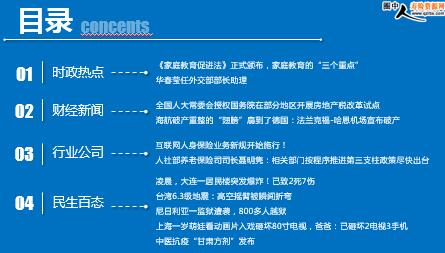 每日新闻速递 2021年10月25日 星期一 目录 时政热点 财经新闻 行业公司 民生百态 头条新闻 《家庭教育促进法》正式颁布,家庭教育的“三个重点” 华春莹任外交部部长助理 全国人大常委会授权国务院在部分地区开展房地产税改革试点 海航破产重整的“翅膀”扇到了德国:法兰克福-哈恩机场宣布破产 互联网人身保险业务新规开始施行! 人社部养老保险司司长聂明隽:相关部门正抓紧按程序推进第三支柱政策尽快出台 凌晨,大连一居民楼突发爆炸!已致2死7伤 台湾6.3级地震:高空摇臂被瞬间折弯 尼日利亚一监狱遭袭,800多人越狱 上海一岁萌娃看动画片入戏砸坏80寸电视,爸爸:已砸坏2电视3手机 中医抗疫“甘肃方剂”发布 时政热点 《家庭教育促进法》正式颁布,家庭教育的“三个重点” 2021年10月23日 10:50:11 来源:秀才教育在线 今天,全国人大通过了《家庭教育促进法》,这是继国家通过“双减”政策后的又一重大举措,希望广大家长朋友高度重视,并且真正做到养育、教育齐头并进。具体来说,家长在家庭教育中要重点关注的有以下三点:一、孩子良好品行的养成;二、孩子良好习惯的养成;三、孩子毅志力、向上力的培养。 华春莹任外交部部长助理 2021-10-24 12:54:03 来源:红星新闻 中国外交部官网显示,华春莹升任中国外交部部长助理,分管新闻、礼宾以及翻译工作。