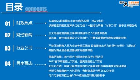 每日新闻速递 2021年10月27日 星期三 目录 时政热点 财经新闻 行业公司 民生百态 头条新闻 31省份25日新增本土确诊病例29例,涉及5省份 求解特定问题比超算快亿亿亿倍!中国成功研制“九章二号”量子计算原型机 三大电信运营商前三季净利润超千亿 5G渗透率提升 碳达峰、碳中和顶层设计文件出炉!开展低碳零碳负碳和储能新材料、新技术、新装备攻关 严禁保险销售人员为业绩考核买保险 监管接连出手为自保件互保件“划红线” 德国为商业展会重启提供新冠疫情保险 国家药监局:首个国产宫颈癌疫苗获世卫预认证 2022春节前要连上7天班、国庆后要连上7天班 新东方在线:将停止经营中国内地义务教育阶段学科类校外培训服务 特斯拉市值首破一万亿美元,老板身家飙升至2552亿美元 可口可乐宣布推出由100%植物性塑料制成的瓶子 时政热点 31省份25日新增本土确诊病例29例,涉及5省份 2021年10月26日 10:50:11 来源:新京报 据国家卫健委消息,10月25日0—24时,31个省(自治区、直辖市)和新疆生产建设兵团报告新增确诊病例43例。其中境外输入病例14例(广东4例,上海2例,河南2例,广西2例,北京1例,福建1例,山东1例,四川1例),含4例由无症状感染者转为确诊病例(河南2例,广东1例,四川1例);本土病例29例(内蒙古16例,其中阿拉善盟15例、鄂尔多斯市1例;甘肃6例,均在兰州市;北京3例,均在昌平区;宁夏3例,其中银川市1例、吴忠市1例、中卫市1例;山东1例,在日照市),含2例由无症状感染者转为确诊病例(均在宁夏)。无新增死亡病例。新增疑似病例1例,为境外输入病例(在上海)。 求解特定问题比超算快亿亿亿倍!中国成功研制“九章二号”量子计算原型机 2021-10-26 12:54:03 来源:新华网 记者从中国科学技术大学获悉,该校潘建伟、陆朝阳、刘乃乐等人与中科院上海微系统与信息技术研究所、国家并行计算机工程技术研究中心合作,近期成功构建113个光子144模式的量子计算原型机“九章二号”,求解高斯玻色取样数学问题比目前全球最快的超级计算机快10的24次方倍(亿亿亿倍),在研制量子计算机之路上迈出重要一步。