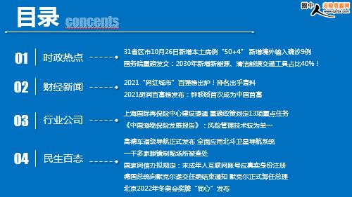 每日新闻速递 2021年10月28日 星期四 目录 时政热点 财经新闻 行业公司 民生百态 头条新闻 31省区市10月26日新增本土病例“50+4” 新增境外输入确诊9例 国务院重磅发文:2030年新增新能源、清洁能源交通工具占比40%! 2021“网红城市”百强榜出炉!排名出乎意料 2021胡润百富榜发布:钟睒睒首次成为中国首富 上海国际再保险中心建设提速 重磅政策划定13项重点任务 《中国宠物保险发展报告》:风险管理技术较为单一 未能贯穿产品全生命周期 高德车道级导航正式发布 全面应用北斗卫星导航系统 一千多家眼镜制配场所被查处 国家网信办拟规定:未成年人互联网账号应真实身份注册 德国总统向默克尔递交任期结束通知 默克尔正式卸任总理 北京2022年冬奥会奖牌“同心”发布 时政热点 31省区市10月26日新增本土病例“50+4” 新增境外输入确诊9例 2021年10月27日 10:50:11 来源:中国科学院微生物研究所 10月26日0—24时,31个省(自治区、直辖市)和新疆生产建设兵团报告新增确诊病例59例。其中境外输入病例9例(上海2例,广东2例,天津1例,辽宁1例,福建1例,山东1例,广西1例),含3例由无症状感染者转为确诊病例(天津1例,辽宁1例,广东1例);本土病例50例(内蒙古32例,其中阿拉善盟31例、锡林郭勒盟1例;贵州5例,均在遵义市;山东4例,均在日照市;甘肃4例,其中兰州市3例、陇南市1例;北京3例,其中昌平区2例、丰台区1例;宁夏2例,均在银川市),含6例由无症状感染者转为确诊病例(贵州5例,北京1例)。无新增死亡病例。无新增疑似病例。 国务院重磅发文:2030年新增新能源、清洁能源交通工具占比40%! 2021-10-27 12:54:03 来源:新华网 10月26日,国务院发布《2030年前碳达峰行动方案》,提出推动运输工具装备低碳转型,积极扩大电力、氢能、天然气、先进生物液体燃料等新能源、清洁能源在交通运输领域应用。 具体措施包括,大力推广新能源汽车,逐步降低传统燃油汽车在新车产销和汽车保有量中的占比,推动城市公共服务车辆电动化替代,推广电力、氢燃料、液化天然气动力重型货运车辆。提升铁路系统电气化水平。加快老旧船舶更新改造,发展电动、液化天然气动力船舶,深入推进船舶靠港使用岸电,因地制宜开展沿海、内河绿色智能船舶示范应用。提升机场运行电动化智能化水平,发展新能源航空器。