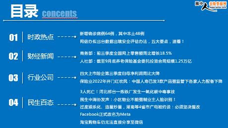 每日新闻速递 2021年10月30日 星期六 目录 时政热点 财经新闻 行业公司 民生百态 头条新闻 新增确诊病例64例,其中本土48例 网信办拟出台数据出境安全评估办法,五大要点,速看! 商务部:前三季度全国网上零售额同比增长18.5% 储能节电产品网上销售走俏 人社部:截至9月底养老保险基金委托投资合同规模1.25万亿 四大上市险企第三季度归母净利润同比大降 保险股被持仓位已降至近十年底部 保险业2022年开门红吹风:中国人寿已发3款产品 强监管下各家人力配备下降 3人死亡!河北邢台一炼铁厂发生一氧化碳中毒事故 民生中消协发声:小区物业不能强制业主人脸识别! 过度娱乐化、追星炒星,湖南等4省市广电被约谈:必须坚决整改 Facebook正式改名为Meta 淘宝购物车仍无法直接分享至微信 时政热点 新增确诊病例64例,其中本土48例 2021年10月29日 10:50:11 来源:新华社 10月28日0—24时,31个省(自治区、直辖市)和新疆生产建设兵团报告新增确诊病例64例。其中境外输入病例16例(广东4例,上海3例,广西3例,浙江2例,云南2例,北京1例,内蒙古1例),含5例由无症状感染者转为确诊病例(浙江2例,广东2例,广西1例);本土病例48例(内蒙古19例,其中阿拉善盟18例、锡林郭勒盟1例;甘肃12例,其中兰州市10例、张掖市2例;黑龙江9例,均在黑河市;青海3例,均在西宁市;北京2例,均在昌平区;宁夏2例,均在银川市;云南1例,在德宏傣族景颇族自治州),含3例由无症状感染者转为确诊病例(均在黑龙江)。无新增死亡病例。新增疑似病例1例,为境外输入病例。 网信办拟出台数据出境安全评估办法,五大要点,速看! 2021-10-29 12:54:03 来源:每日经济新闻 网信中国微信公众号10月29日消息。为了规范数据出境活动,保护个人信息权益,维护国家安全和社会公共利益,促进数据跨境安全、自由流动,我办起草了《数据出境安全评估办法(征求意见稿)》,现向社会公开征求意见。数据处理者向境外提供数据,符合以下情形之一的,应当通过所在地省级网信部门向国家网信部门申报数据出境安全评估。 (一)关键信息基础设施的运营者收集和产生的个人信息和重要数据; (二)出境数据中包含重要数据; (三)处理个人信息达到一百万人的个人信息处理者向境外提供个人信息; (四)累计向境外提供超过十万人以上个人信息或者一万人以上敏感个人信息; (五)国家网信部门规定的其他需要申报数据出境安全评估的情形。