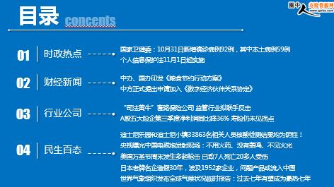 每日新闻速递 2021年11月2日 星期二 目录 时政热点 财经新闻 行业公司 民生百态 头条新闻 国家卫健委:10月31日新增确诊病例92例,其中本土病例59例 个人信息保护法11月1日起实施 中办、国办印发《粮食节约行动方案》 中方正式提出申请加入《数字经济伙伴关系协定》 “司法黄牛”套路保险公司 监管行业拟联手反击 A股五大险企第三季度净利润同比降36% 寿险仍未见拐点 迪士尼乐园和迪士尼小镇33863名相关人员核酸检测结果均为阴性! 央视曝光中国电磁炮发射现场:不用火药、没有轰鸣、不见火光 美国万圣节周末发生多起枪击 已致7人死亡20多人受伤 日本老牌名企造假30年,波及1952家企业,问题产品或流入中国 世界气象组织发布全球气候状况临时报告:过去七年有望成为最热七年 时政热点 国家卫健委:10月31日新增确诊病例92例,其中本土病例59例 2021-11-01 09:03 来源:红星新闻 10月31日0—24时,31个省(自治区、直辖市)和新疆生产建设兵团报告新增确诊病例92例。其中境外输入病例33例(上海9例,浙江8例,云南4例,福建3例,山东3例,四川3例,内蒙古1例,广西1例,重庆1例),含12例由无症状感染者转为确诊病例(浙江8例,四川2例,福建1例,广西1例);本土病例59例(黑龙江27例,其中黑河市25例、哈尔滨市2例;甘肃10例,其中兰州市5例、天水市5例;河北9例,其中石家庄市7例、保定市2例;内蒙古6例,其中阿拉善盟5例、锡林郭勒盟1例;宁夏3例,均在银川市;浙江1例,在杭州市;江西1例,在九江市;山东1例,在日照市;青海1例,在西宁市),含3例由无症状感染者转为确诊病例(均在河北)。无新增死亡病例。 个人信息保护法11月1日起实施 2021-11-01 12:54:03 来源:同花顺财经 《中华人民共和国个人信息保护法》于2021年11月1日起施行。法律明确不得过度收集个人信息、大数据杀熟,对人脸信息等敏感个人信息的处理作出规制,完善个人信息保护投诉、举报工作机制等,充分回应了社会关切,为破解个人信息保护中的热点难点问题提供了强有力的法律保障。