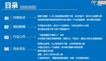 每日新闻速递 2021年11月3日 星期三 目录 时政热点 财经新闻 行业公司 民生百态 头条新闻 国家卫健委:11月1日新增确诊病例71例,涉及9省市,其中本土病例54例 商务部发通知鼓励家庭储存生活必需品?不应过度解读,更无需盲目囤物 字节跳动大变阵:成立六个业务板块,今日头条等并入抖音 茅台酒价连续下降 已有产品跌超40% “中国地震巨灾模型3.5”发布 中宏保险与复旦发展研究院:保险行业“轻创业”提供女性职业发展新路径 陕西拟出新规:生三孩奖励半年假,父母有带薪育儿假 中国正在成为一个包邮国,这件事比想象中更加厉害 雅虎中国正式关闭 速报:日本11月8日开放入境 31省养老金PK,西藏爸妈荷包最鼓!专家:未来差距会缩小 时政热点 国家卫健委:11月1日新增确诊病例71例,涉及9省市,其中本土病例54例 2021-11-02 09:03 来源:红星新闻 11月1日0—24时,31个省(自治区、直辖市)和新疆生产建设兵团报告新增确诊病例71例。其中境外输入病例17例(上海5例,浙江3例,福建2例,广东2例,云南2例,北京1例,天津1例,广西1例),含4例由无症状感染者转为确诊病例(浙江3例,天津1例);本土病例54例(黑龙江27例,其中黑河市26例、哈尔滨市1例;河北8例,其中石家庄市4例,辛集市4例;甘肃8例,均在天水市;山东3例,均在日照市;内蒙古2例,均在阿拉善盟;江西2例,均在上饶市;青海2例,均在西宁市;北京1例,在昌平区;宁夏1例,在银川市),含5例由无症状感染者转为确诊病例(山东3例,江西2例)。无新增死亡病例。新增疑似病例2例,均为境外输入病例(均在上海)。 商务部发通知鼓励家庭储存生活必需品?不应过度解读,更无需盲目囤物 2021-11-02 12:54:03 来源:上观新闻 近日,商务部印发《关于做好今冬明春蔬菜等生活必需品市场保供稳价工作的通知》(以下简称《通知》),部署各地深入贯彻落实党中央、国务院决策部署,保障今冬明春广大人民群众生活必需品供应充足,切实做好市场保供稳价工作。 这份《通知》中的一句话很受公众关注:“鼓励家庭根据需要储存一定数量的生活必需品,满足日常生活和突发情况的需要”。有部分网友和自媒体围绕“突发情况”进行解读,认为这份《通知》不同寻常。 但记者梳理发现,这并不是商务部第一次发布类似通知,主要目的是提醒公众提高应急意识,并没有特殊含义,无需过度解读。
