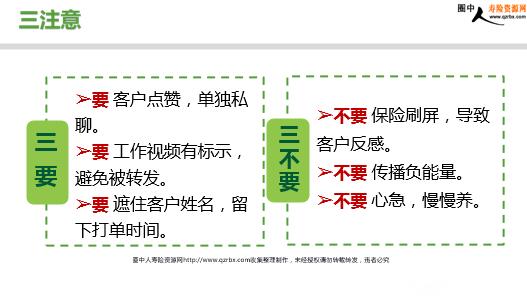如何利用微信经营客户及打造你的微形象 微营销的优势 移动互联时代,移动终端填充人们的碎片时间,移动社交应是中国手机网民的第一大应用,而微信是NO.1的社交应用。 微信发布的《2019年微信数据报告》中显示,2019年微信的月活跃账户数超过了11.5亿日常沟通、微信小程序、微信会员卡、健康码…… 越来越离不开微信。 为什么91%的500强企业都拥有了微信公众平台? 超11亿微信用户,数量庞大,未来的市场所在;率先把握先机,抢占移动互联网的传播先机;传统营销模式滞后,移动网络营销更快速及时;更贴身、更实时的互动和服务,提高客户粘度; 微信已经成为互联网新热点! Contents 微信能带来什么 面访遇到的难题…… 客户忙 生活节奏加快,家庭工作兼顾 距离远 城市扩建,距离拉长 个人原因 客户储备不足,个人没有时间展业技能不成熟,面对客户有压力 客户防备心理 行业发展周期,客户理性程度提升。 面访难题 微信,不仅仅是聊天工具 1、缓解紧张感,投石问路,树立信心。 2、接触面更广,新的客户源源不断。 3、节约时间,效率提升。 如何做好微信经营 ●清晨问候 ●节日问候 ●生日问候 微信经营 日常经营 添加微信好友 问候 保险观念 产品 ●社保政策 ●公司理赔案例 ●行业/公司政策 ●产品宣传 ●产品介绍 ●微信群:拼单群、业主群、家长群 ●转介绍: ●主动添加:偶遇、参加活动 怎么做好微信经营呢? 用心经营朋友圈重点维护准客户 怎么添加好友呢? 微信群:多刷存在感,有助添加好友附近的人,或者日常偶遇。 普遍撒网重点培养 用本人真实头像展示,大方得体。添加成功后备注加好友时间,便于后期管理。 怎么做好日常经营呢? 筛选优质准客户
