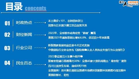 每日新闻速递 2021年01月04日 星期二 目录 时政热点 财经新闻 行业公司 民生百态 本土确诊+101,在陕西和浙江 我国与日本首次建立双边自贸关系 2022年,全球股市或将经受“紧缩”震荡 美国2021年通胀率同比增长6.8%,创近四十年来新高 新版国家医保药品目录今天正式实施 中国保险行业协会发布《保险销售从业人员执业失信行为认定指引》 2022春运首日火车票今起开售 旅客安检通行率提高约30%!全国40家大型机场推出"易安检"服务 四川江油发生车祸,造成8死19伤 全国首例!苏州查处首起全国碳市场碳排放配额未按期履约违法案件 美国防部长,阳性 时政热点 本土确诊+101,在陕西和浙江 2022-01-03 09:39 来源:澎湃新闻 1月2日0—24时,31个省(自治区、直辖市)和新疆生产建设兵团报告新增确诊病例161例。其中境外输入病例60例(上海26例,广西7例,广东6例,内蒙古5例,北京4例,天津2例,福建2例,河南2例,云南2例,浙江1例,山东1例,四川1例,陕西1例),含7例由无症状感染者转为确诊病例(广西3例,广东2例,河南1例,四川1例);本土病例101例(陕西92例,其中西安市90例、咸阳市1例、延安市1例;浙江9例,均在宁波市)。无新增死亡病例。无新增疑似病例。 我国与日本首次建立双边自贸关系 2022-01-03 09:39 来源:澎湃新闻 1月1日 ,RCEP开始生效,包括中国在内的10个国家正式开始履行义务,这标志着全球最大的自由贸易区启动运行,也为中国经济迎来了开门红。 其中,我国与日本是首次建立双边自贸关系,达成双边关税减让安排,实现了历史性的突破。