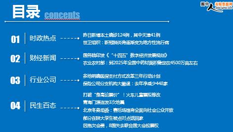 每日新闻速递 2021年01月14日 星期五 目录 时政热点 财经新闻 行业公司 民生百态 头条新闻 昨日新增本土确诊124例,其中天津41例 世卫组织:新冠肺炎将逐渐变为地方性流行病 国务院印发《“十四五”数字经济发展规划》 农业农村部:到2025年全国中药材面积稳定在4500万亩左右 多地明确医保支付方式改革三年行动计划 保险公司分支机构大撤退:去年净减少448家 打破“身高论票价”!火车儿童票拟修改 青海门源连发3次地震 北京冬奥组委:赛后场馆将全面向社会公众开放 部分在陕大学生被点对点送回家 因拖欠会费,8国失去联合国大会投票权 时政热点 昨日新增本土确诊124例,其中天津41例 2022-01-13 09:25 来源:澎湃新闻 1月12日0—24时,31个省(自治区、直辖市)和新疆生产建设兵团报告新增确诊病例190例。其中境外输入病例66例(上海31例,广东17例,天津6例,福建5例,浙江4例,广西2例,北京1例),含6例由无症状感染者转为确诊病例(浙江4例,广东2例);本土病例124例(河南76例,其中安阳市43例、许昌市28例、郑州市3例、信阳市1例、滑县1例;天津41例,其中津南区40例、河西区1例;陕西6例,均在西安市;广东1例,在深圳市)。无新增死亡病例。新增疑似病例9例,均为境外输入病例(均在上海)。 世卫组织:新冠肺炎将逐渐变为地方性流行病 2022-01-13 11:32 来源:央视新闻 当地时间12日,世卫组织举行新冠肺炎例行发布会,世卫组织卫生紧急项目技术主管玛丽亚•范•科霍夫表示,毫无疑问新冠肺炎将逐渐变为地方性流行病,但现在还处于新冠肺炎大流行中。 玛丽亚•范•科霍夫同时强调,新冠病毒仍在演变,未来可能出现新的变异病毒,所以新冠肺炎不会像流感那样可预测。RT称,这种高传染性的变异毒株已经导致整个欧洲大陆的感染率急剧上升。上周,法国创下了24小时内新增病例超30万例的纪录。