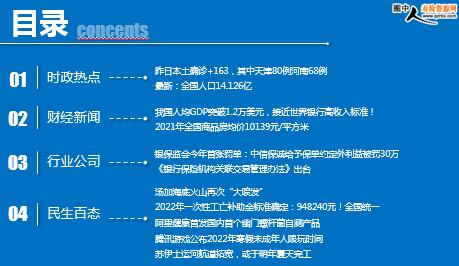 每日新闻速递 2021年01月18日 星期二 目录 时政热点 财经新闻 行业公司 民生百态 头条新闻 昨日本土确诊+163,其中天津80例河南68例 最新:全国人口14.126亿 我国人均GDP突破1.2万美元,接近世界银行高收入标准! 2021年全国商品房均价10139元/平方米 银保监会今年首张罚单:中信保诚给予保单约定外利益被罚30万 《银行保险机构关联交易管理办法》出台 汤加海底火山再次“大喷发” 2022年一次性工亡补助金标准确定:948240元!全国统一 阿里健康首发国内首个幽门螺杆菌自测产品 腾讯游戏公布2022年寒假未成年人限玩时间 苏伊士运河航道拓宽,或于明年夏天完工 时政热点 昨日本土确诊+163,其中天津80例河南68例 2022-01-17 09:25 来源:澎湃新闻 1月16日0—24时,31个省(自治区、直辖市)和新疆生产建设兵团报告新增确诊病例223例。其中境外输入病例60例(上海35例,广东8例,四川5例,广西3例,浙江2例,云南2例,北京1例,辽宁1例,福建1例,山东1例,河南1例),含10例由无症状感染者转为确诊病例(四川5例,广东4例,浙江1例);本土病例163例(天津80例,其中津南区79例、东丽区1例;河南68例,其中安阳市60例、许昌市7例、郑州市1例;广东9例,其中珠海市5例、深圳市2例、梅州市1例、中山市1例;陕西5例,均在西安市;广西1例,在崇左市),含1例由无症状感染者转为确诊病例(在广东)。无新增死亡病例。新增疑似病例4例,均为境外输入病例(均在上海)。 最新:全国人口14.126亿 2022-01-17 11:32 来源:光明网 截至2021年末,全国人口(包括31个省、自治区、直辖市和现役军人人口,不包括居住在31个省、自治区、直辖市的港澳台居民和外籍人口)141260万人,比上年末增加48万人。