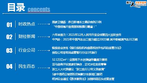 每日新闻速递 2021年01月22日 星期六 目录 时政热点 财经新闻 行业公司 民生百态 头条新闻 国家卫健委:昨日新增本土确诊病例23例 “中国领海不容美国军舰横行霸道!” 六年来首次!2021年12月人民币升至全球第四大活跃货币 中汽协:2021年中国汽车出口首次超过200万辆 其中新能源汽车31万辆 银保监会发布《银行保险机构信息科技外包风险监管办法》 保险公司非现场监管暂行办法3月施行 52.1万亿m³!全国地下水资源储存量首次查明 亚马逊将开设首家时装店,正式涉足实体零售 浙江人大代表建议“浙江实行12年义务教育” 5家中国药企被授权仿制默沙东新冠口服药 欧洲议会通过《数字服务法》加强网络巨头经营监管 时政热点 国家卫健委:昨日新增本土确诊病例23例 2022-01-21 09:25 来源:国家卫健委 1月20日0—24时,31个省(自治区、直辖市)和新疆生产建设兵团报告新增确诊病例73例。其中境外输入病例50例(上海28例,广东10例,山东6例,北京2例,福建2例,河南1例,广西1例),含2例由无症状感染者转为确诊病例(河南1例,广东1例);本土病例23例(天津8例,均在津南区;北京5例,其中房山区3例、丰台区2例;广东4例,均在珠海市;河南3例,均在安阳市;陕西3例,均在西安市)。无新增死亡病例。新增疑似病例1例,为境外输入病例(在上海)。 “中国领海不容美国军舰横行霸道!” 2022-01-20 11:32 来源:澎湃新闻 1月20日,国防部新闻发言人吴谦就美舰擅闯中国西沙领海发表谈话。美军“本福德”号导弹驱逐舰未经中国政府批准,非法闯入中国西沙群岛领海、内水。中国人民解放军南部战区组织海空兵力对美舰进行跟踪监视并予以警告驱离,中国军队对美方行径表示强烈不满和坚决反对。