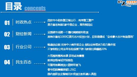 每日新闻速递 2021年01月25日 星期二 目录 时政热点 财经新闻 行业公司 民生百态 头条新闻 西安市今起恢复正常出行,有序复工复产 美方宣布制裁3家中国企业,商务部回应 全国碳市场第一个履约周期顺利收官 英特尔宣布1000亿美元芯片投资计划,目标是建成“全球最大芯片制造基地” 畅通供应链 支持中小微外贸企业 保险业持续发力助力稳外贸 37家财险公司去年车险保费下跌 8家同比降幅超20% 大范围雨雪再来袭 多地或有暴雪 教师资格考试开始报名 可复用液氧煤油火箭明年首飞 春节档预售票房破1.25亿 国内首款自主智能无针疫苗注射机器人亮相 时政热点 西安市今起恢复正常出行,有序复工复产 2022-01-24 12:43 来源:南方都市报 自2022年1月24日起,西安全市降为低风险地区。恢复正常出行,离市人员凭西安一码通“绿码”出行,不需开具离市证明。公交车、出租车、网约车、地铁、班线客车等交通工具全面恢复运营。有序复工复产。 美方宣布制裁3家中国企业,商务部回应 2022-01-22 11:32 来源:澎湃新闻 商务部新闻发言人就美方宣布制裁3家中国企业发表谈话。商务部新闻发言人表示:我们注意到,美国务院以所谓“参与导弹技术扩散活动”为由,对3家中国企业和下属研究机构实施制裁。中方对此强烈不满,坚决反对。中方一贯严格履行防扩散国际义务。美方没有任何事实依据,以“莫须有”的理由,肆意打压制裁中国企业,严重损害双方企业的利益,破坏正常的国际经贸秩序,威胁全球产业链供应链安全稳定,不利于世界经济恢复和发展。 美方应立即纠正错误做法。中方将采取必要措施,坚决维护中国企业合法权益。