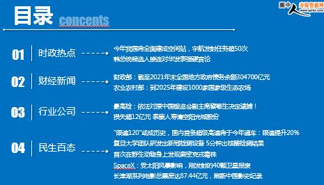 每日新闻速递 2021年2月11日 星期五 目录 时政热点 财经新闻 行业公司 民生百态 头条新闻 今年我国将全面建成空间站,宇航发射任务超50次 韩总统候选人接连对华发表强硬言论 财政部:截至2021年末全国地方政府债务余额304700亿元 农业农村部:到2025年建设1000家国家级生态农场 最高检:依法对原中国银监会副主席蔡鄂生决定逮捕! 损失超12亿元 泰康人寿清空阳光城股份 "限速120"或成历史,国内首条超级高速将于今年通车:限速提升20% 复旦大学团队研发出新冠检测设备 5分钟出核酸检测结果 首次在野生动物身上发现奥密克戎毒株 SpaceX:受太阳风暴影响,刚发射的40颗卫星报废 长津湖系列电影总票房达87.44亿元,刷新中国影史纪录 时政热点 今年我国将全面建成空间站,宇航发射任务超50次 2022-02-10 12:43 来源:新京报 《中国航天科技(000901)活动蓝皮书(2021年)》发布会召开。2022年,中国航天科技集团计划安排50余次 宇航发射任务;全年载人航天工程实施6次发射任务,全面建成以天和核心舱为控制中心,问天、梦天实验舱 为主要实验平台,常年有人照料的空间站;长征六号甲运载火箭将开展首飞。 韩总统候选人接连对华发表强硬言论 2022-02-10 11:32 来源:环球时报 韩国JTBC电视台9日报道称,距韩国总统大选还有不到一个月,北京冬奥会突然成为一个意想不到的“变数” 。随着所谓“开幕式韩服争议”和“短道速滑裁判争议”持续发酵,韩国国内的反华情绪高涨。韩国朝野政 党总统候选人尹锡悦近日也借势接连发出对华强硬言论。 尹锡悦认为,韩国在中美竞争中应该站在美国一边,还应带头促进自由、开放、包容的印太秩序,他甚至主 张韩国应积极参与美日印澳“四方安全对话”机制。不过,韩国外交安保专家警告称,韩国应该慎重地参与 将中国定性为直接威胁的反华联盟